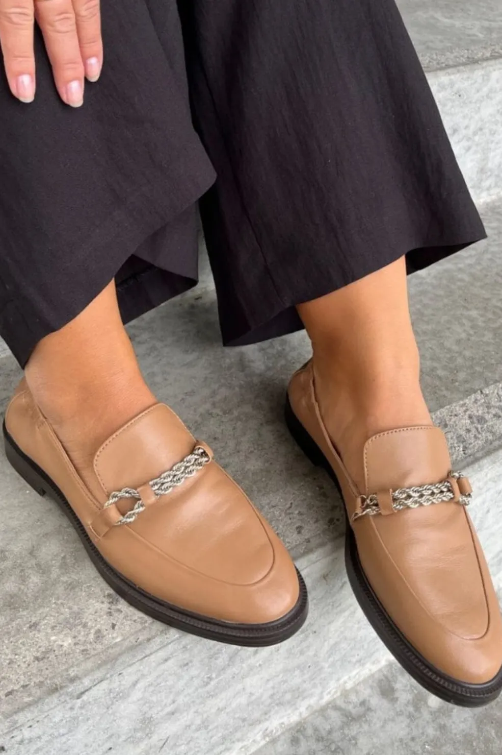 Loafers fra Copenhagen Shoes i blødt læder med cappuccinofarve. Skoen har en specialdesignet latexskum-indersål og dekorative syninger med kædedetalje i guldmetal.