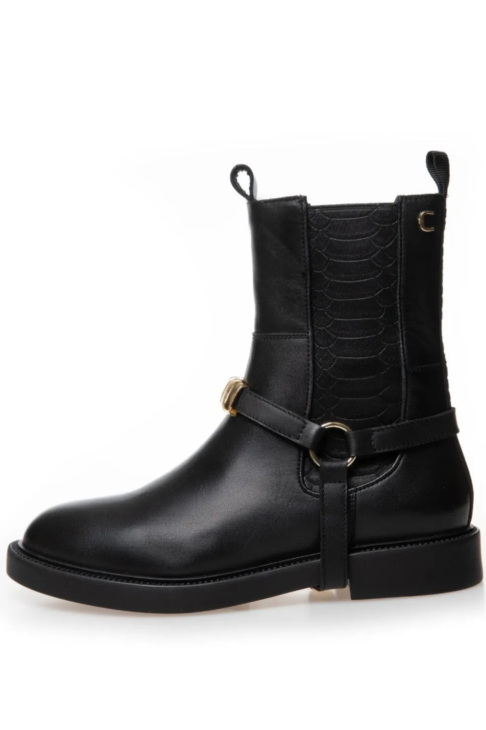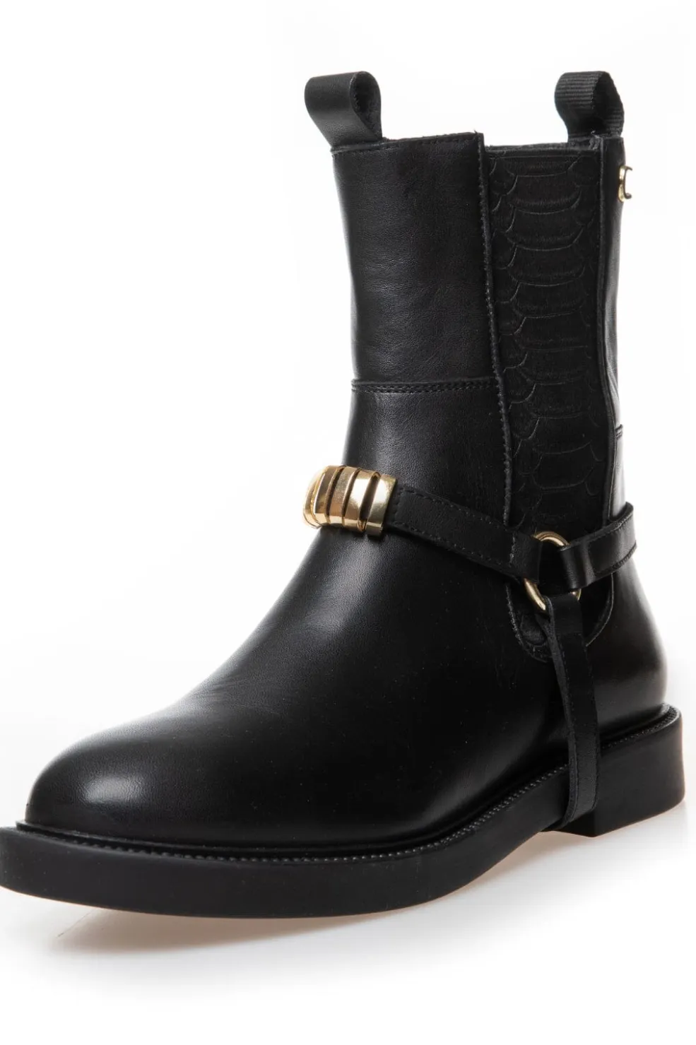 Sorte læderstøvler fra Copenhagen Shoes med gyldne spænder og mønstrede paneler på siderne. Støvlerne har en lav hæl og rund tå.