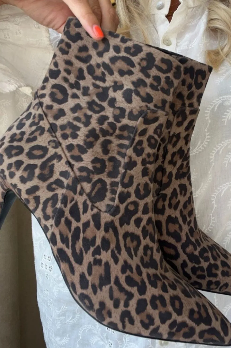 Ankelstøvler fra Copenhagen Shoes i ruskind med leopardprint. Støvlen har spids tå, lynlås på indersiden og en 5-8 cm høj stilethæl.