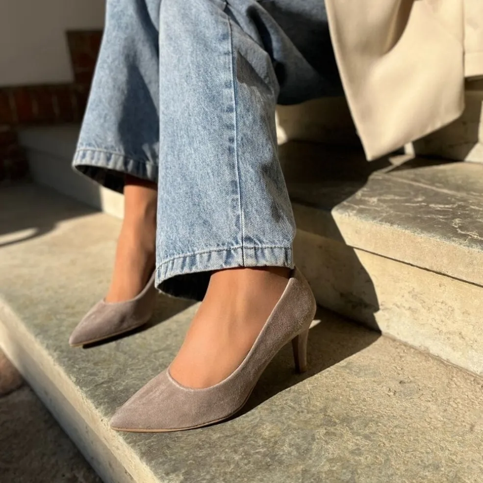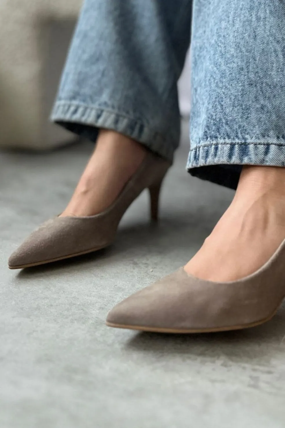 Beige stiletter i ruskind og læder med spids tå og 7 centimeter hæl. Skoen har en fleksibel gummisål og bløde skumindersåler.