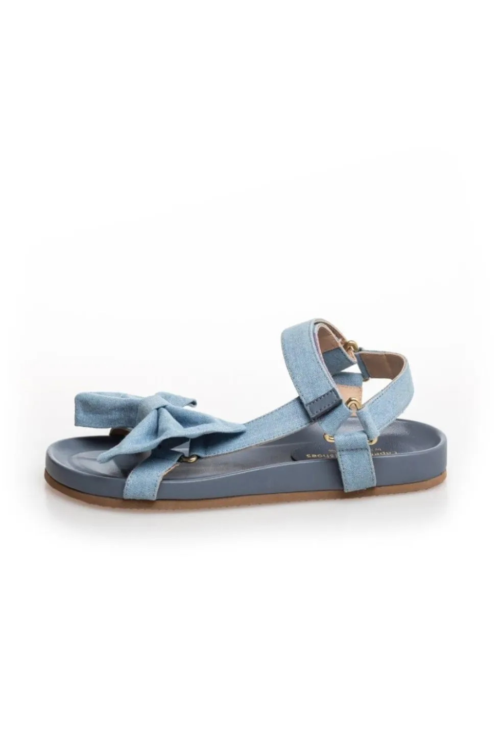 Jeansblå sandaler fra Copenhagen Shoes med store sløjfer i denimlook. Sandalerne har en blød indersål af latexskum og en stødabsorberende gummisål.