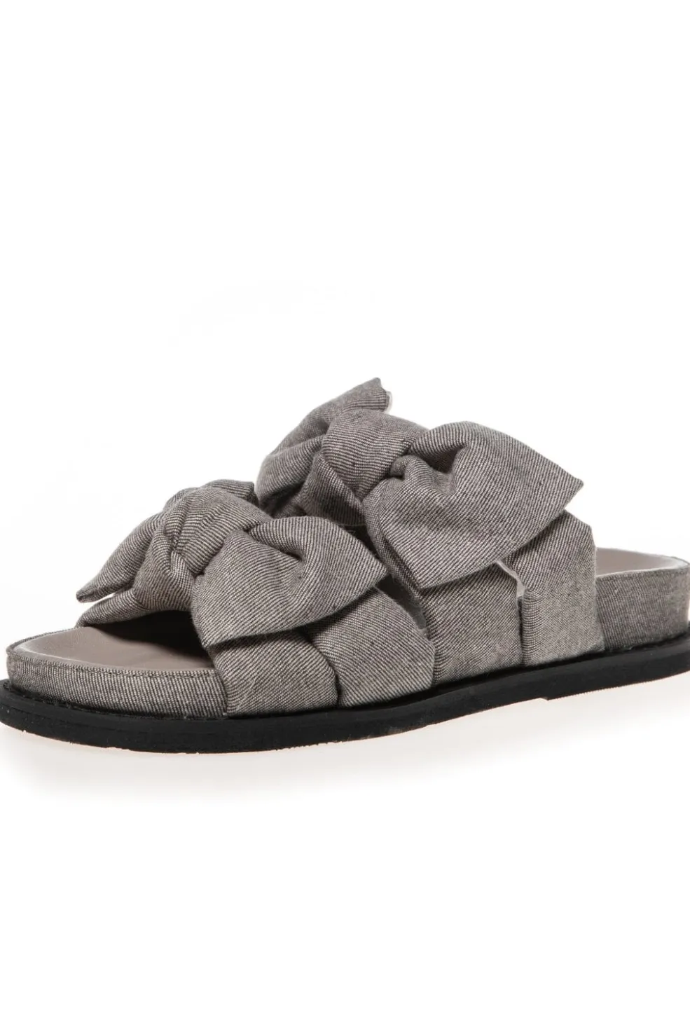 Grå denimsandaler fra Copenhagen Shoes med dekorative sløjfer. Sandalerne har en flad sål og passer til både hverdag og festlige lejligheder.