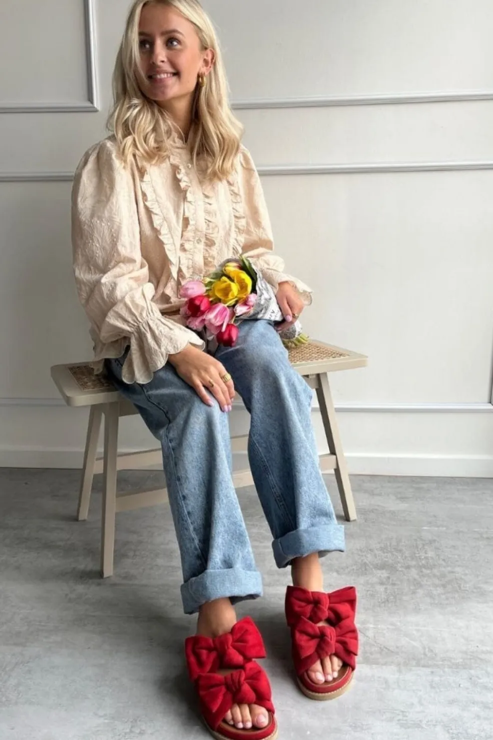 Rød sandal fra Copenhagen Shoes med store sløjfer foran. Sandalerne er lavet i blødt ruskind og har en lav hæl, der gør dem nemme at gå i.