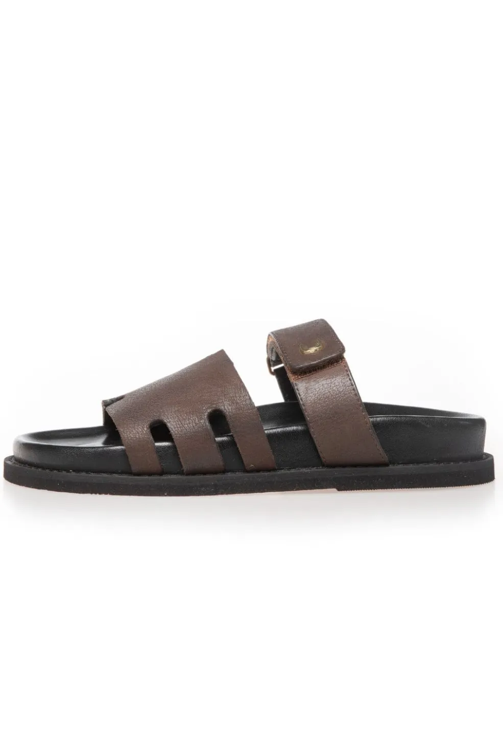 Brun sandal fra Copenhagen Shoes med overdel i nubucklæder. Sandalen har åben tå og en sort EVA-sål med god affjedring. Den justerbare velcrorem giver mulighed for at tilpasse pasformen.