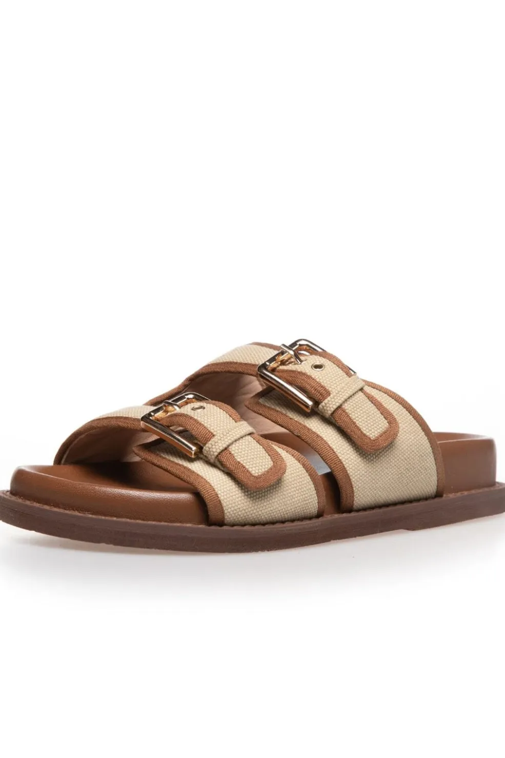 Sandal i let tekstil fra Copenhagen Shoes. En beige og cognacfarvet model med spænder og lav hæl. Skoen har et let og luftigt design med praktiske detaljer.