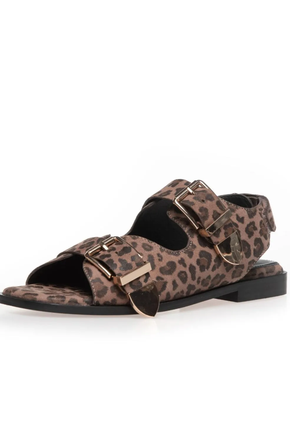 Sandaler fra Copenhagen Shoes i ruskind med leopardprint. Den brune taupe farve og det karakteristiske mønster giver sandalerne et særegent udseende.