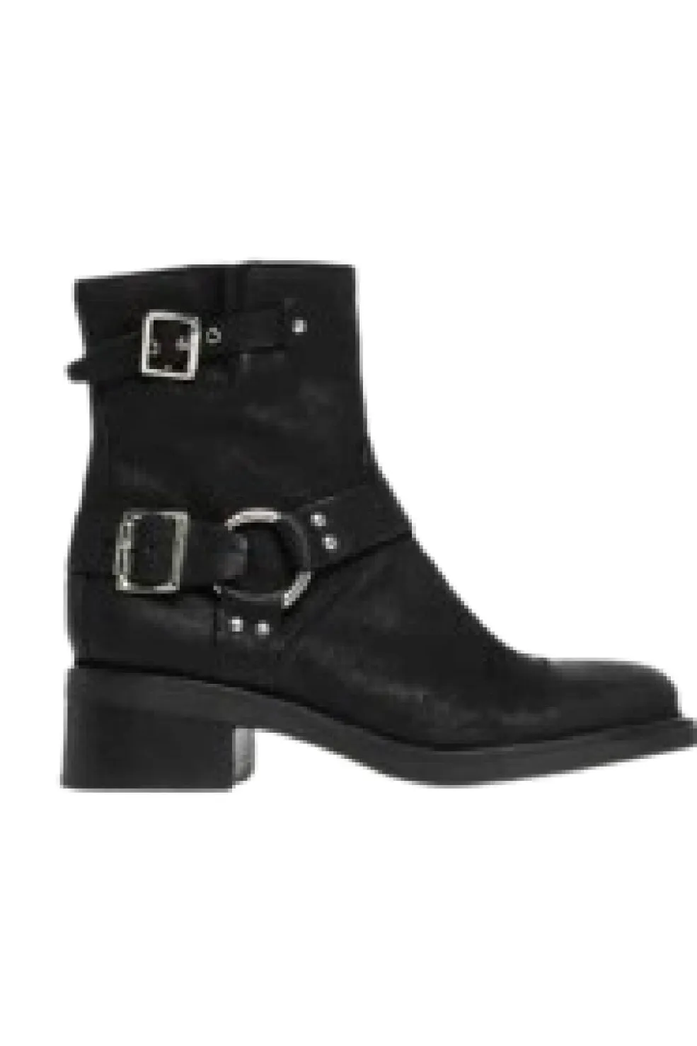 Sorte ankelstøvler fra Copenhagen Shoes i nubuck med remme og spænder i mørksølv. Støvlen har en firkantet snude og en stabil blokhæl.