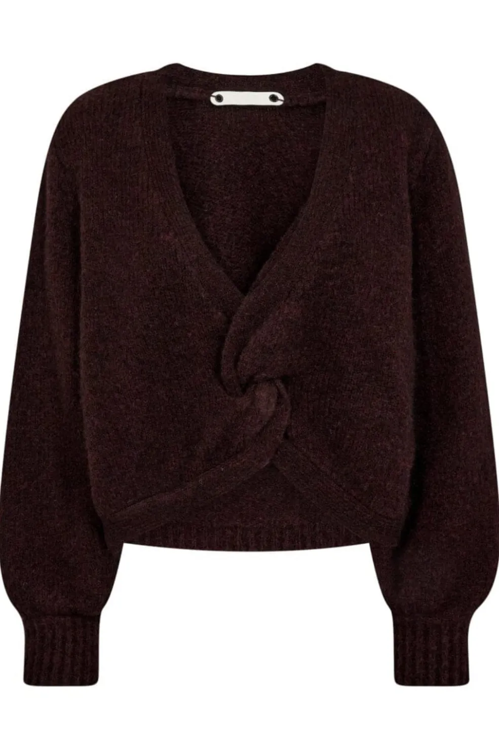 Mørkerød strik fra Co´Couture med v-hals og twist-detalje på ryggen. Strikken har lange ærmer med ribstrikkede manchetter og en meleret overflade i bordeaux-nuancen winered.