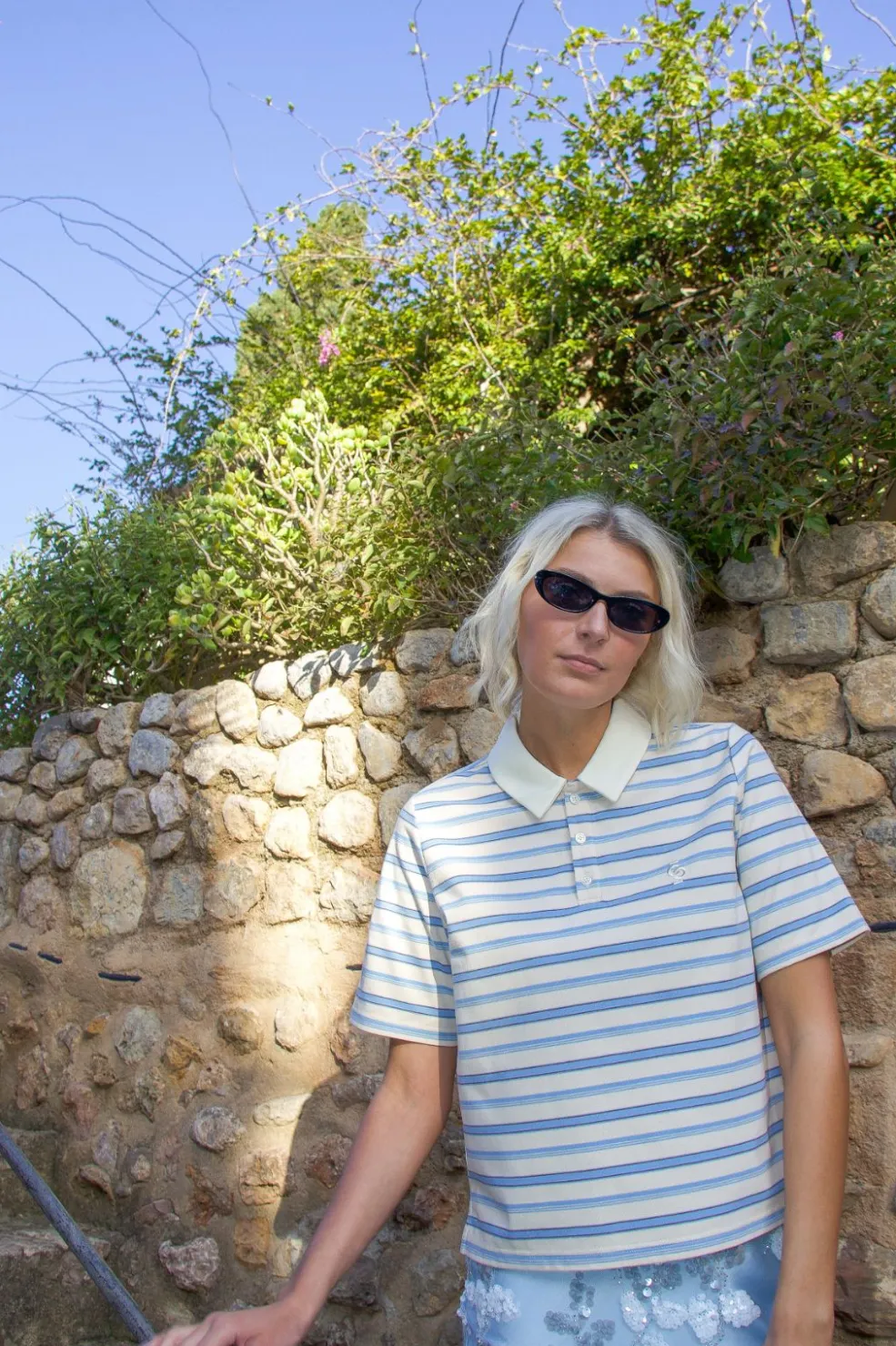 Stribet bluse fra Cras med polokrave og korte ærmer. De lyseblå og cremefarvede striber skaber et harmonisk udtryk, mens det broderede logo på brystet giver et diskret præg.