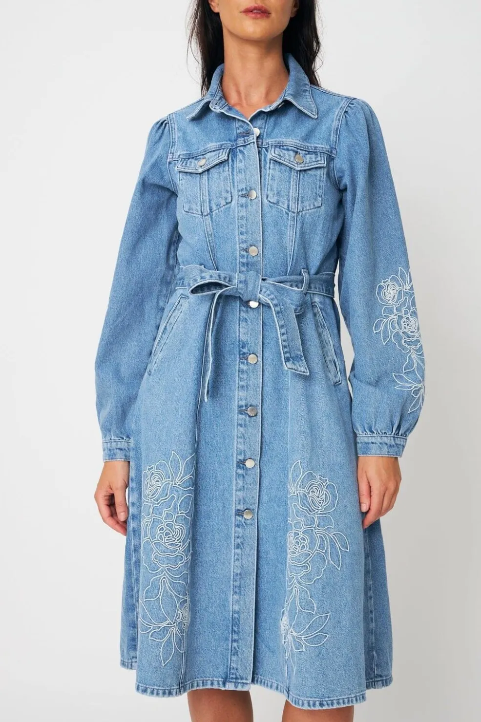 Medium blå denimkjole fra Cras med blomsterbroderi på den nederste del. Kjolen har skjortekrave, knapper hele vejen ned og bindebånd i taljen.