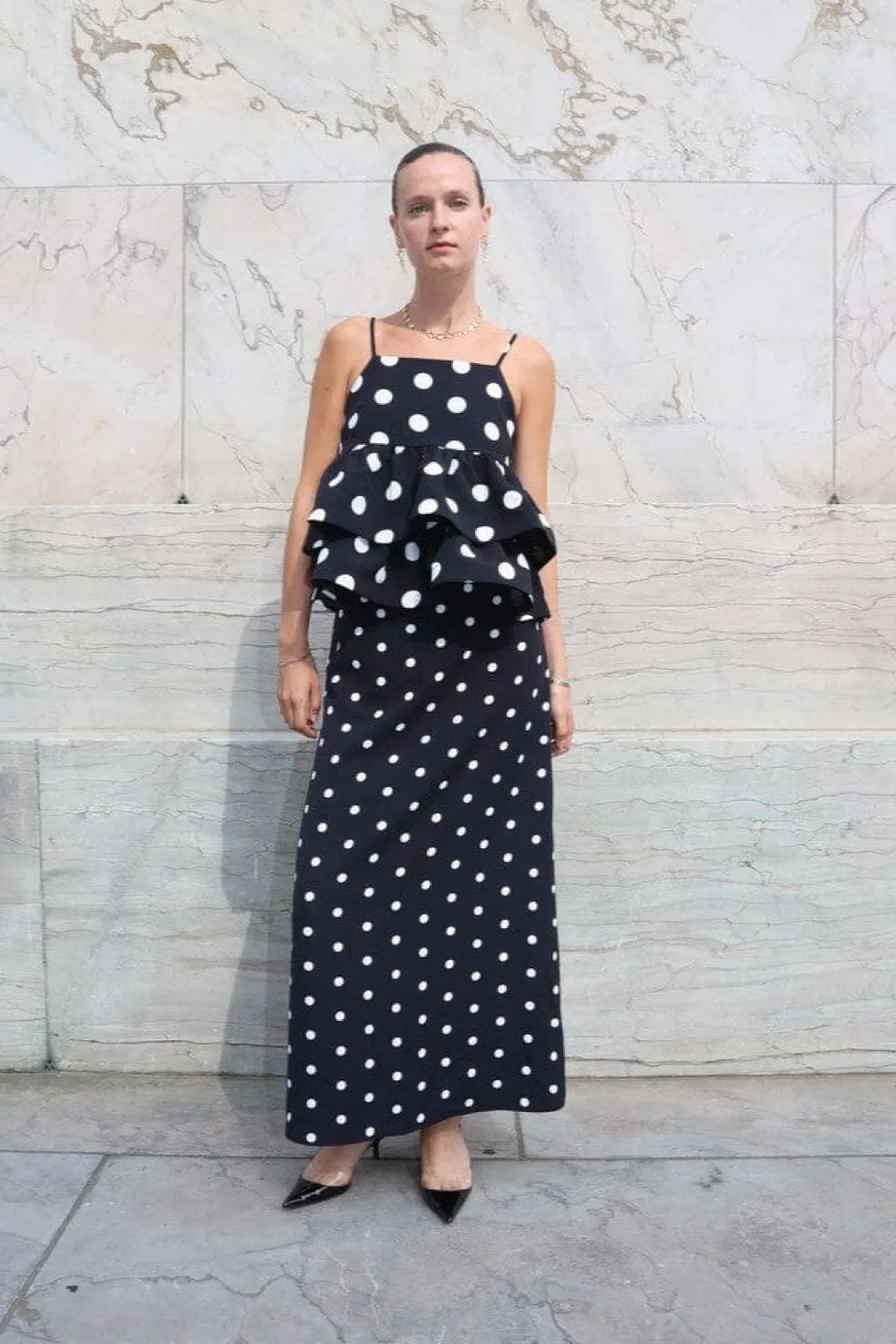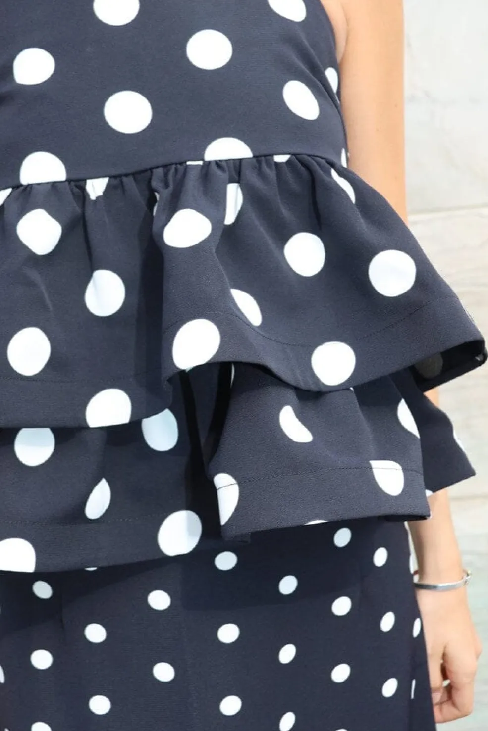 Sort top med store hvide polkaprikker fra Cras. Den firkantede halsudskæring og flæsedetaljerne giver toppen et karakteristisk udtryk. Den sidder løst på kroppen med tynde stropper.