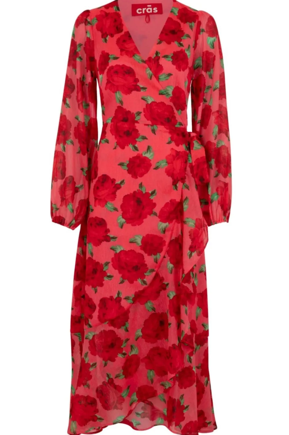 Koralfarvet slå-om-kjole fra Cras med røde roser. Kjolen har flæsedetaljer foran og bindebånd i taljen. De lange ærmer har let puf ved skuldrene, og V-udskæringen giver et feminint udtryk.