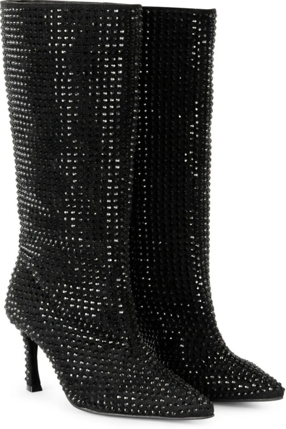 Sorte støvler fra Cras med pailletter på hele overfladen. Støvlerne har en spids tå og stilettohæl. De høje skafter og skinnende detaljer gør dem velegnede til fester og formelle anledninger.