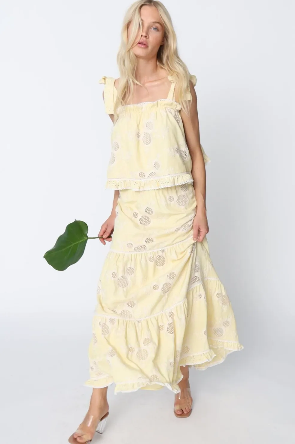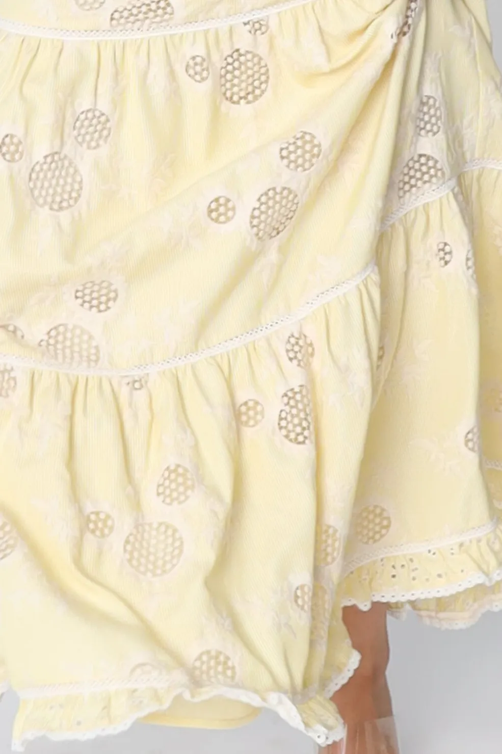 Gul maxinederdel fra Cras med striber og broderi. Den A-formede nederdel har flere lag flæser og en elastisk talje. Stoffet er lavet i en let kvalitet med fine detaljer.
