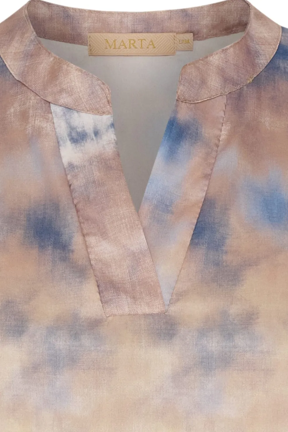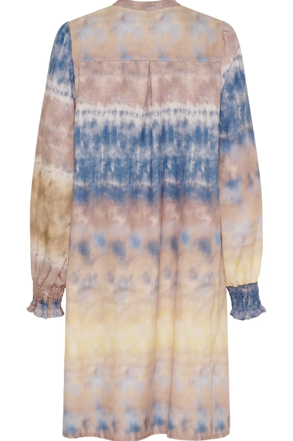 Kjole fra Marta Du Chateau med tie-dye mønster i blå og gule nuancer. Den har lange ærmer med elastik ved håndleddene og en V-hals med krave.