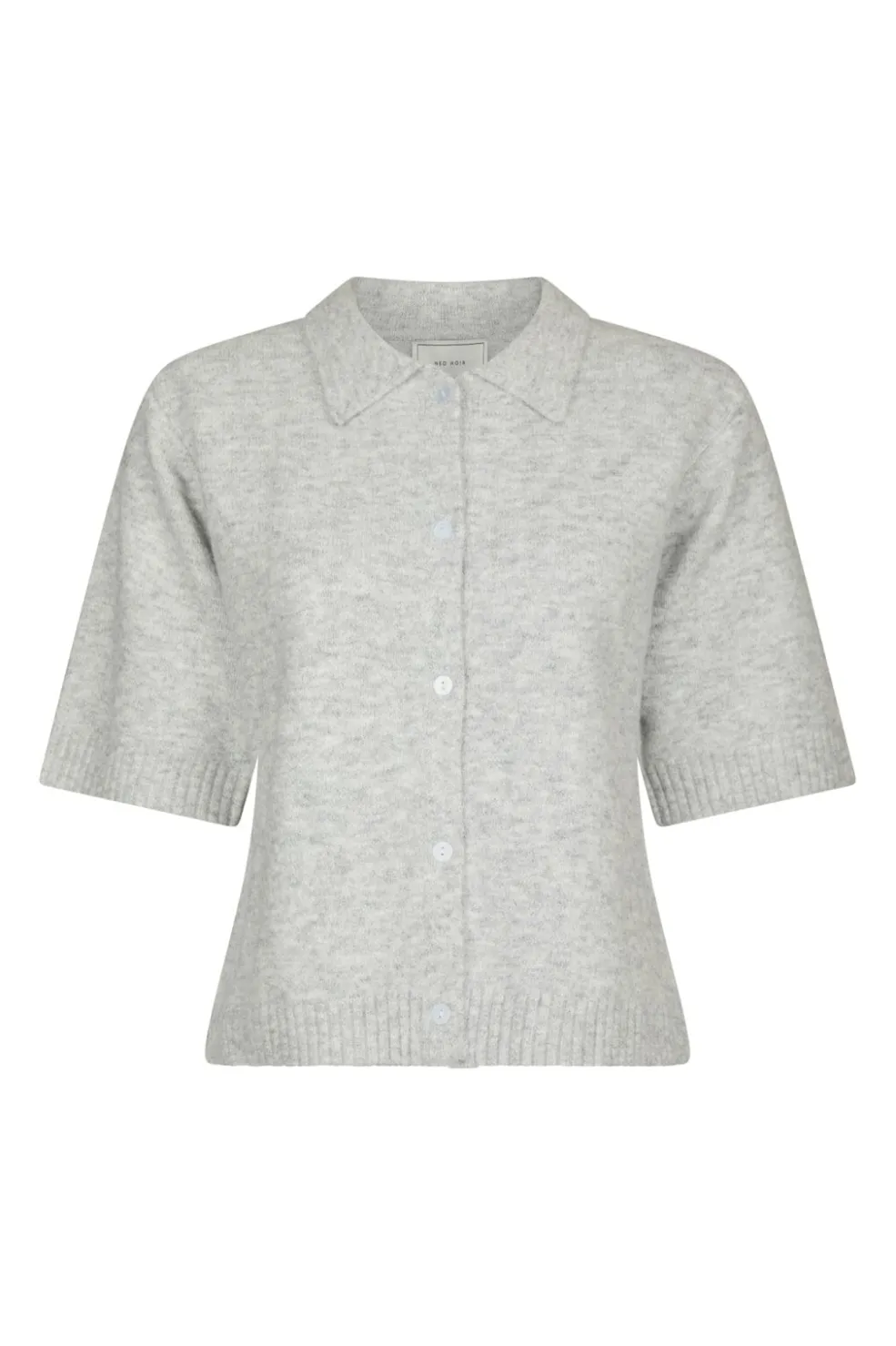 Strikbluse fra Neo Noir i lys grå melange med korte ærmer, krave og knaplukning foran. Blusen er strikket i en materialeblanding med uld.