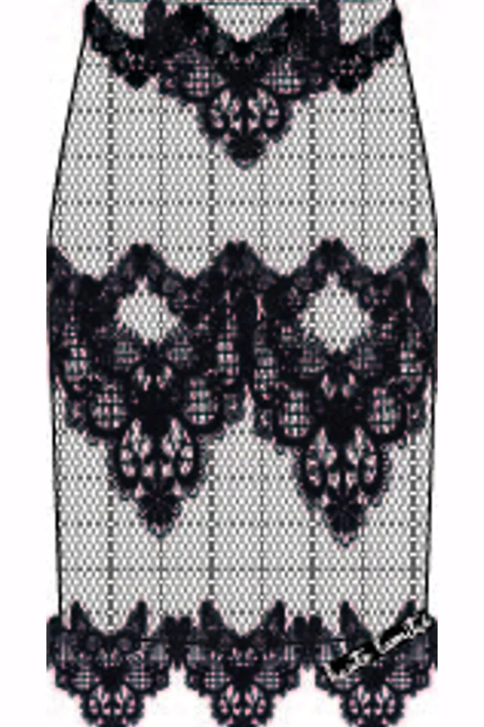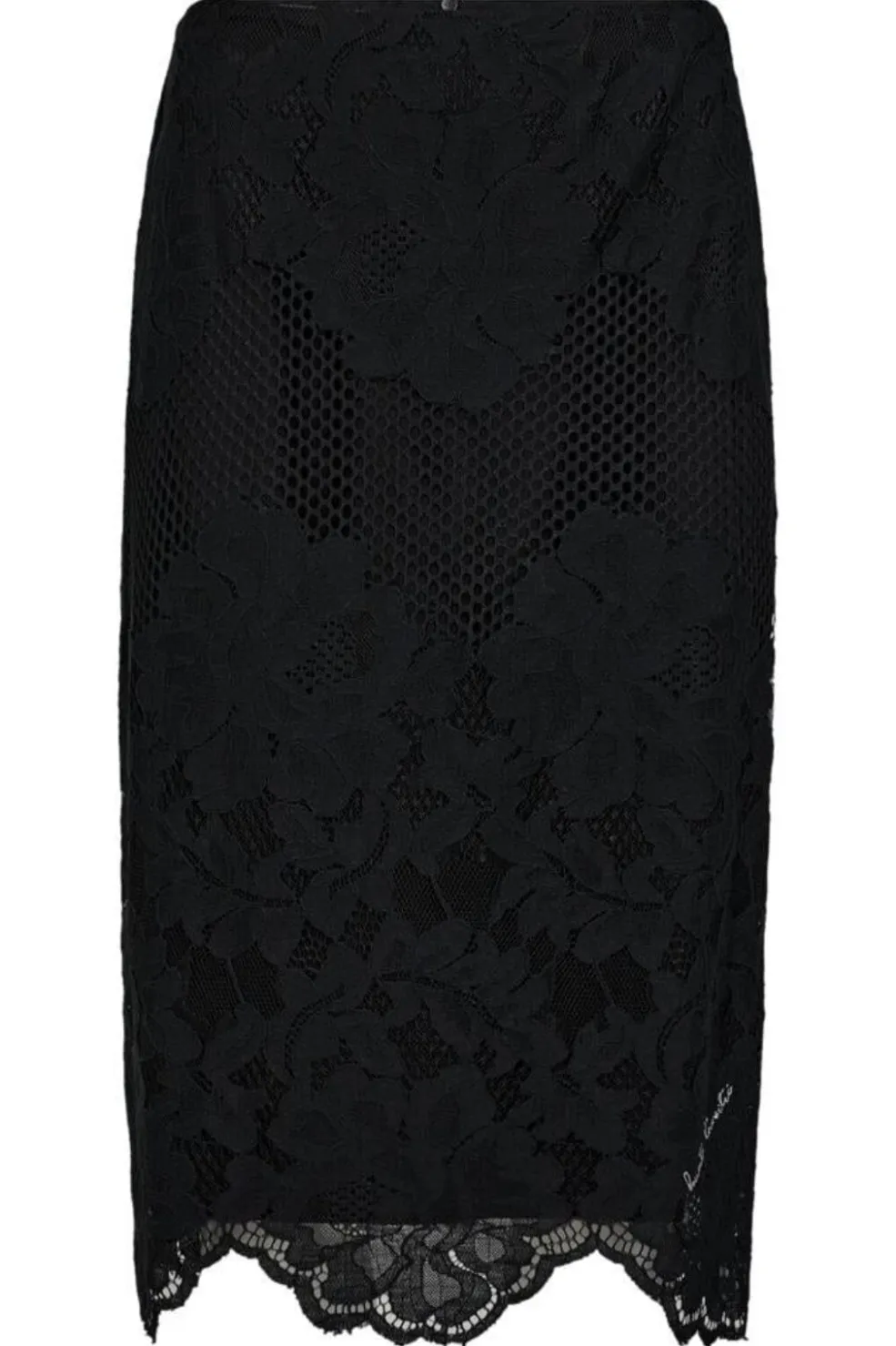 Sort pencilnederdel fra Haute L’Amitié, lavet af blødt blondestof med blomstermønster og mesh-detaljer i designet.