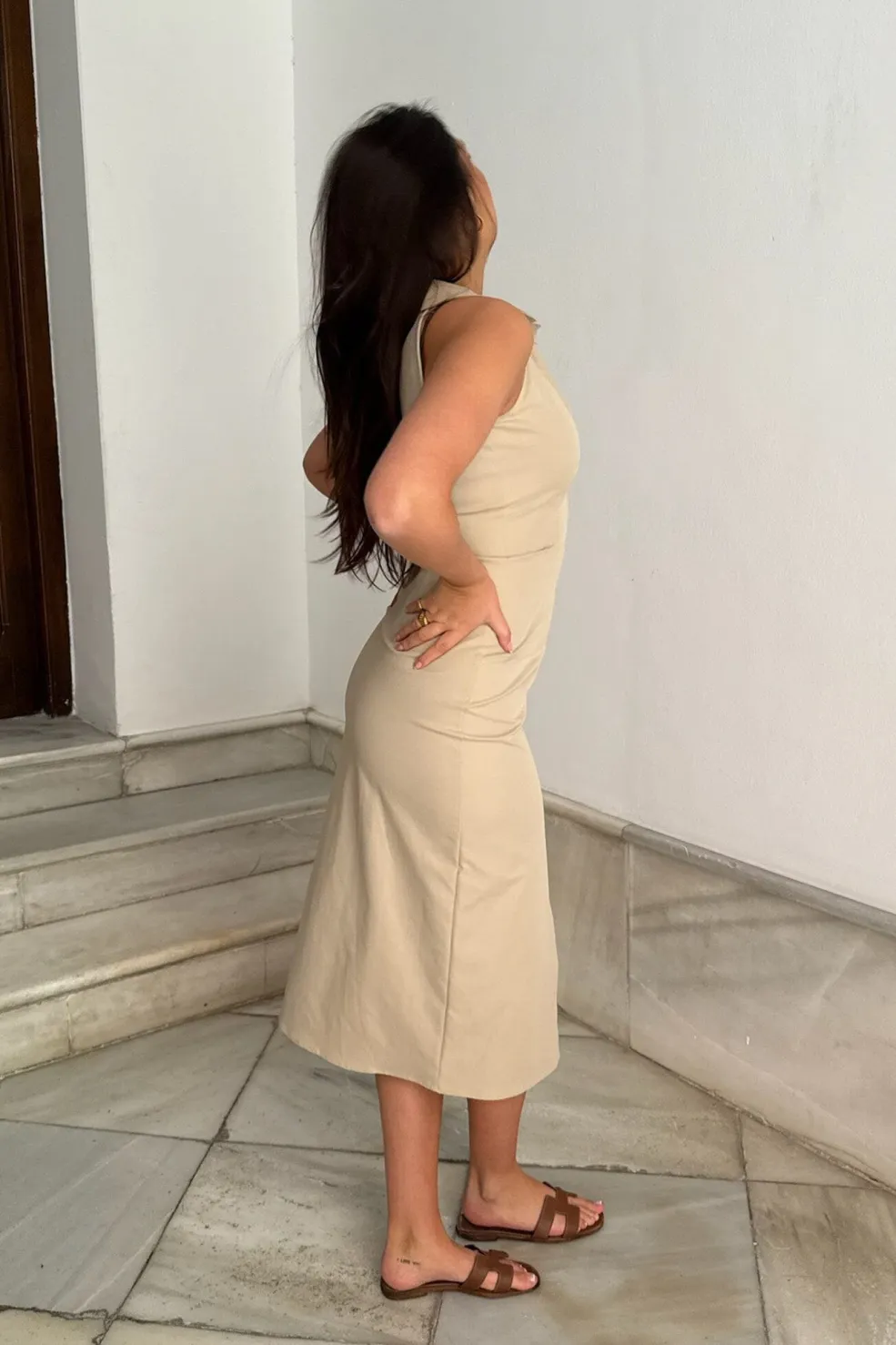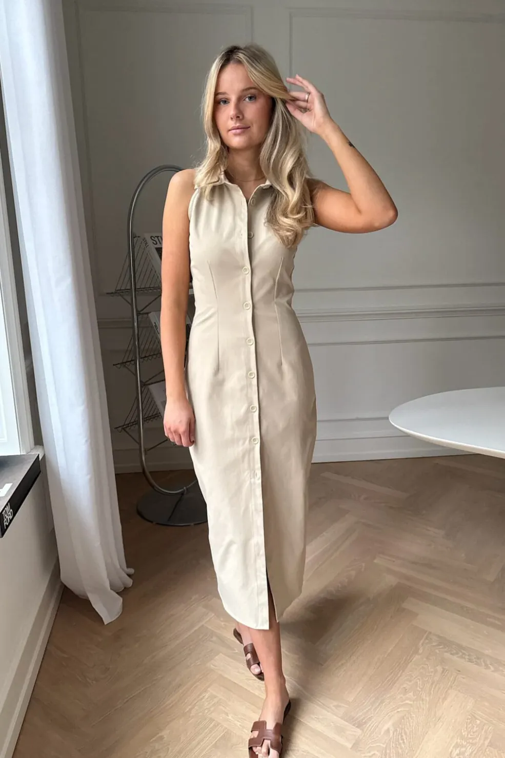 Lang kjole fra BYIC i beige med skjortekrave. Kjolen har knaplukning hele vejen ned og et ærmeløst design med slids foran.