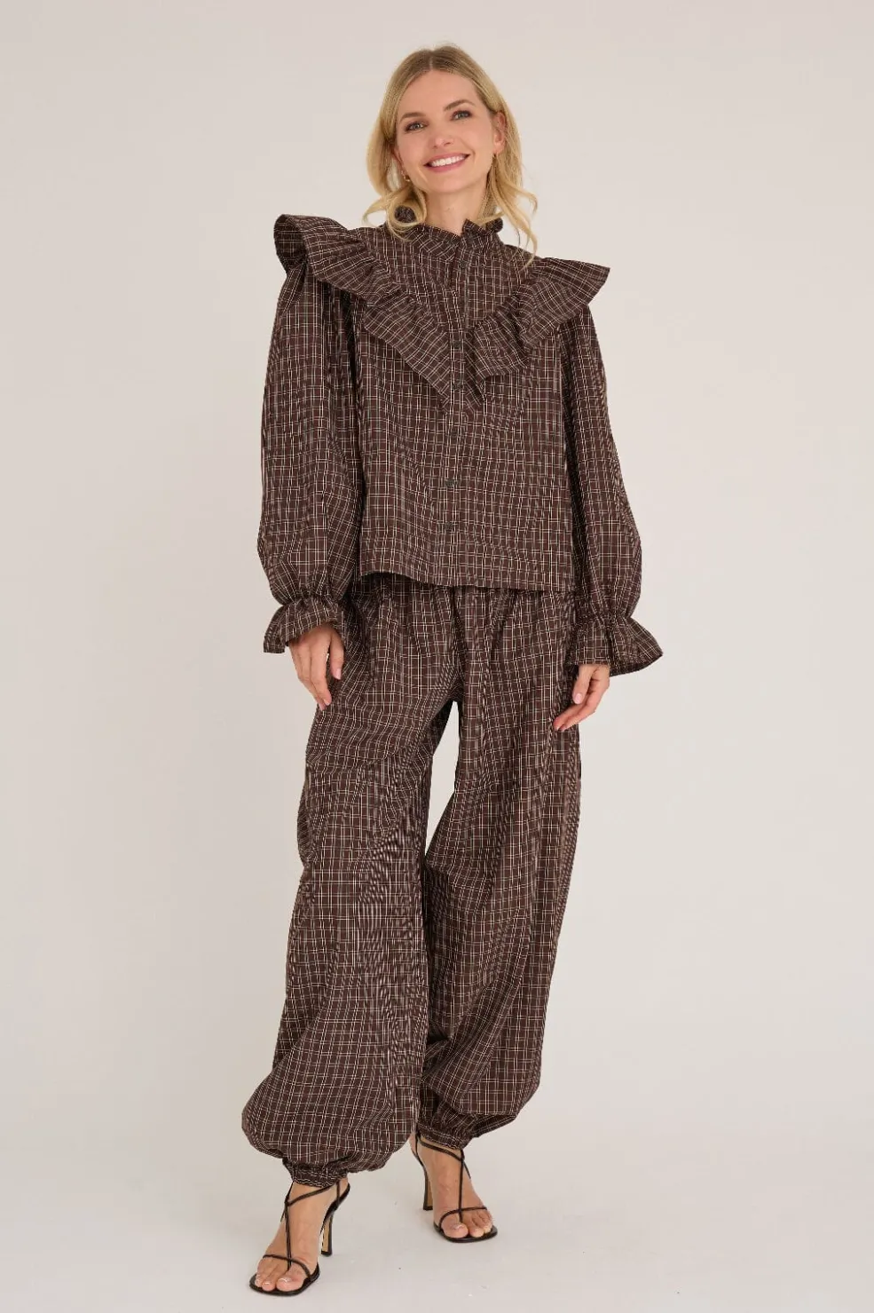 Ternede bukser fra A-View i brun og sand. Bukserne har en løs pasform og ankellængde med elastik og knapper i taljen.