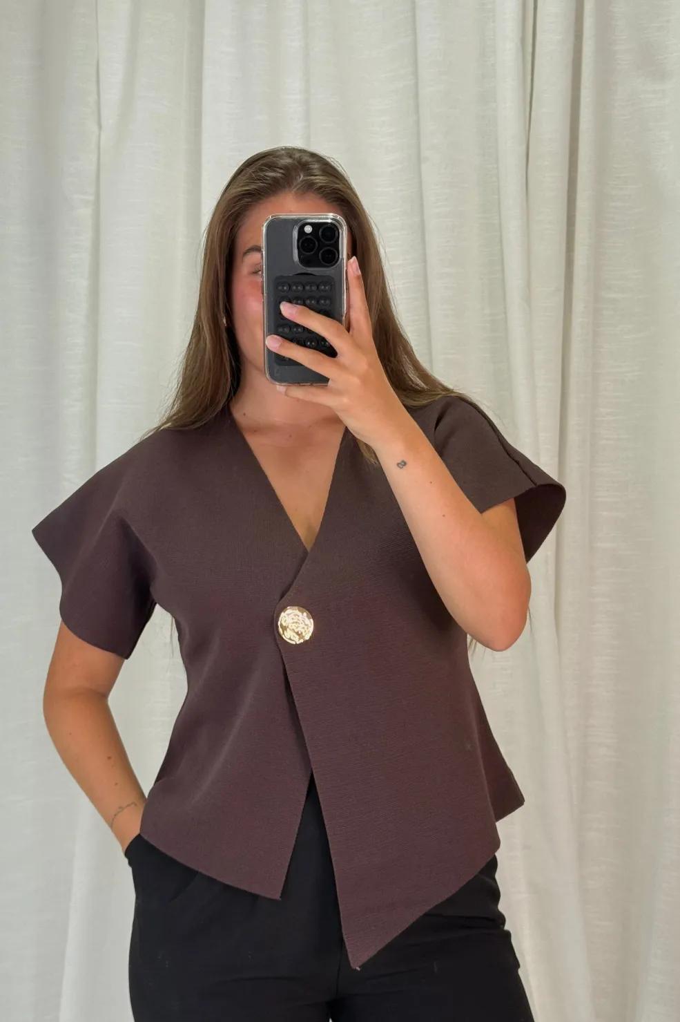 Brun chokoladefarvet top fra A-bee. Toppen passer til både formelle lejligheder, hverdagen og festlige arrangementer.