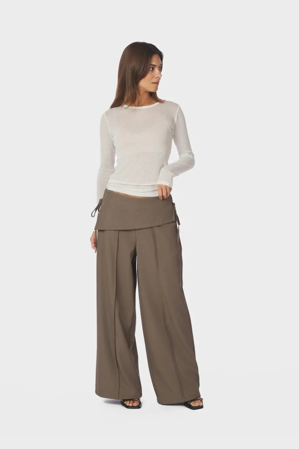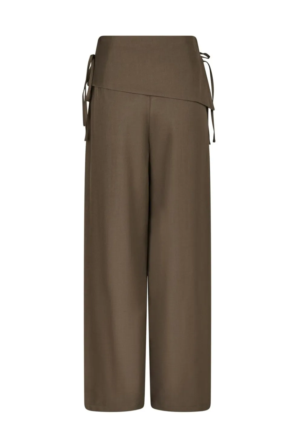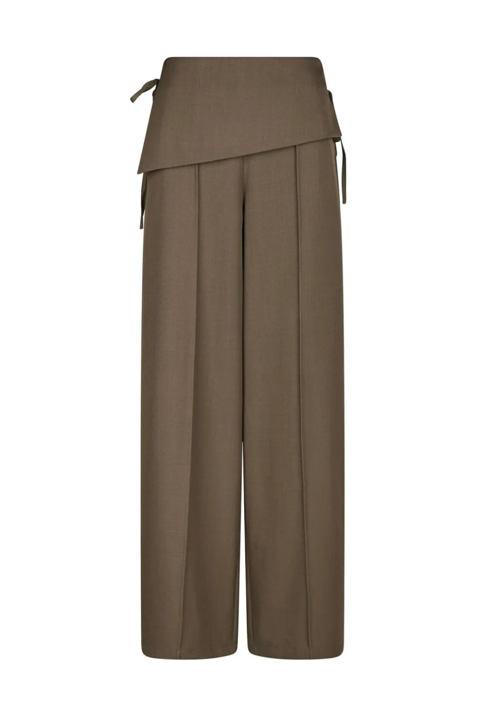 Bukser fra Neo Noir i taupe med høj talje. De har en karakteristisk foldet linning med bindebånd i siden og praktiske lommer. Bukserne går ned til gulvet med en løs pasform.
