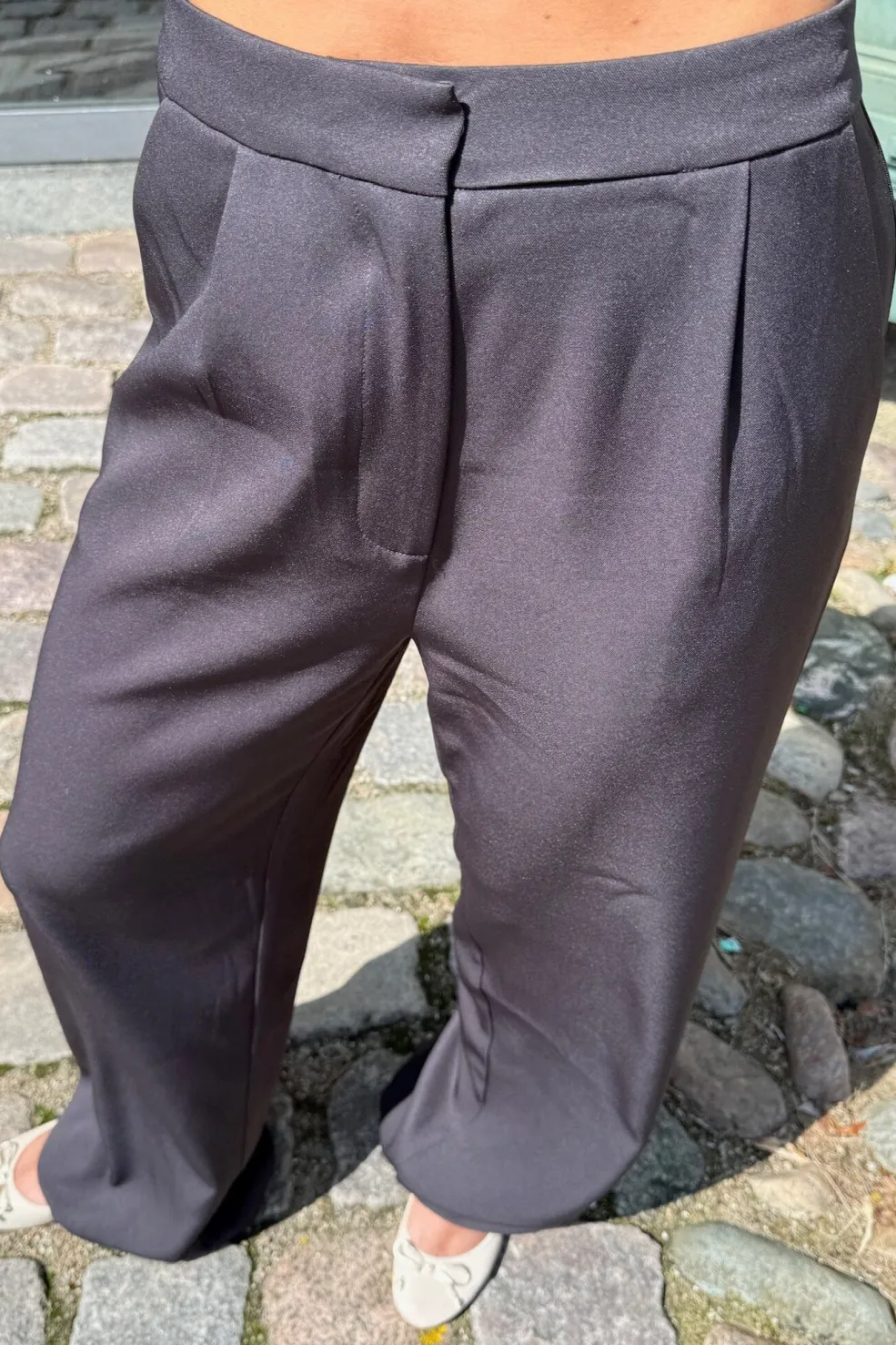 Sorte bukser fra Dear Molly med en løs pasform og gulvlang længde. Bukserne har almindelig taljehøjde og lukkes med lynlås og knapper.