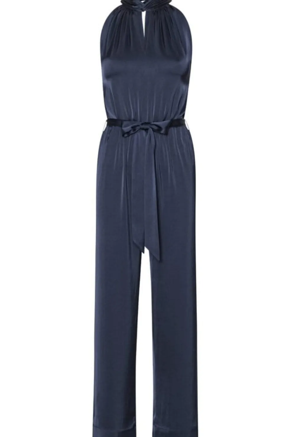 Mørkeblå jumpsuit i gulvlængde med høj hals og nøglehulsudskæring. Designet med bindebånd i taljen og bred benvidde.
