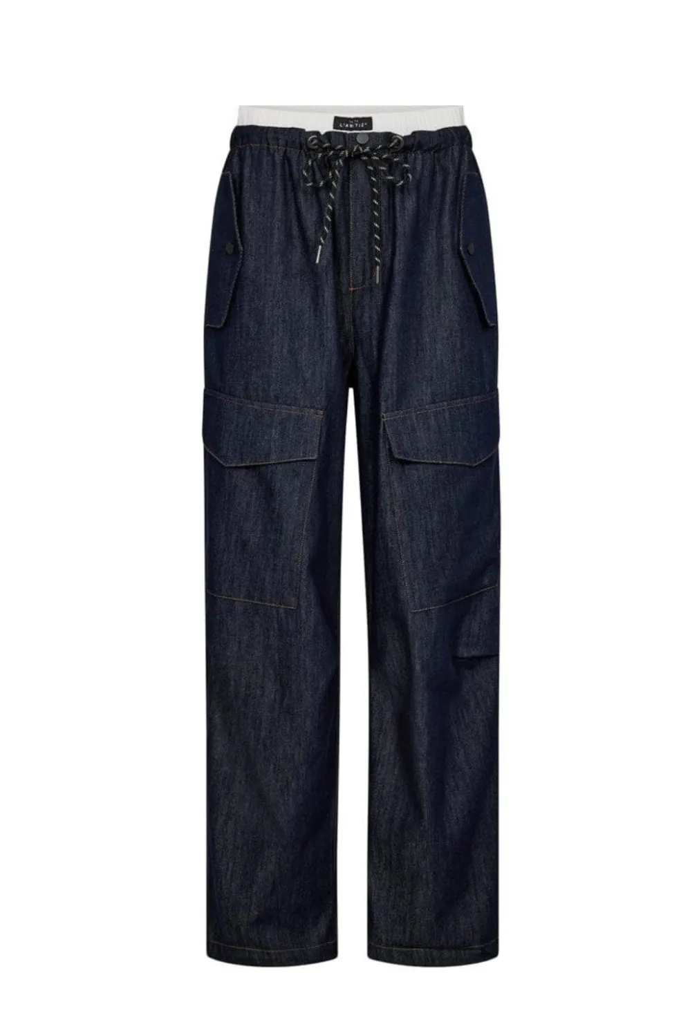 Denim cargo-bukser fra Haute L’Amitié i mørk denim. Bukserne har høj talje, elastik med snøre og store cargo-lommer på siderne.