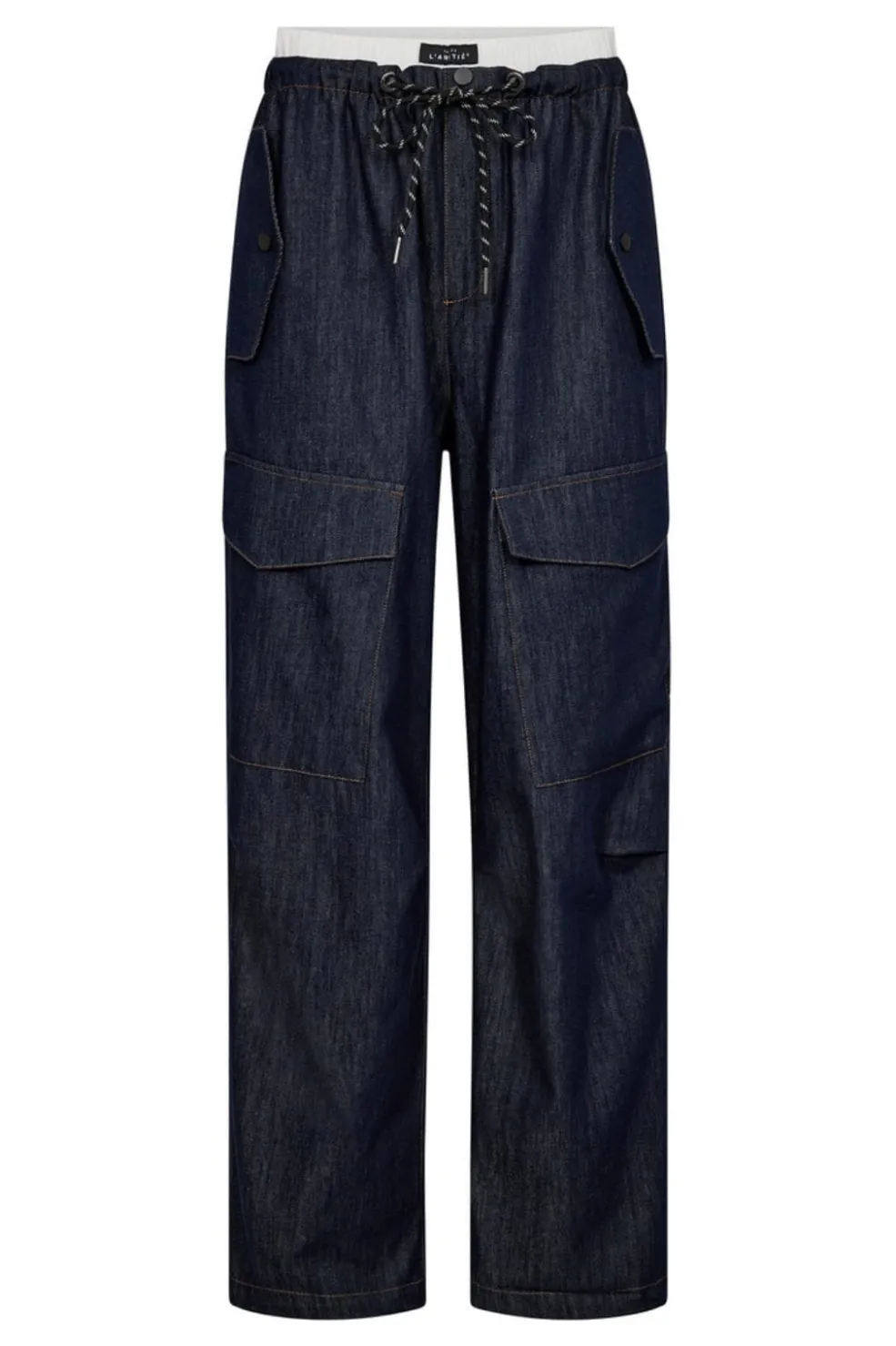Cargo-bukser i mørk denim fra Haute L’Amitié. Bukserne har en løs pasform og er lavet af bomuld med dekorative syninger og snøre-detaljer.