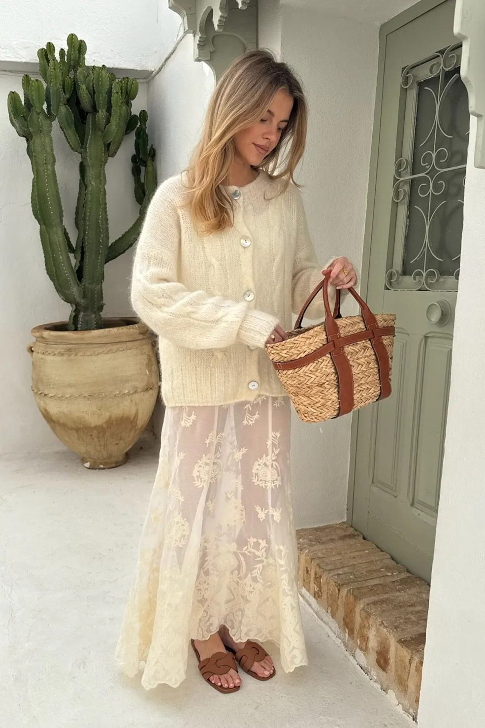 Hvid cardigan fra BYIC med kabelstrik og perledetaljer. Den er strikket i en blanding af mohair og naturfibre, som giver et blødt og fluffy udtryk.