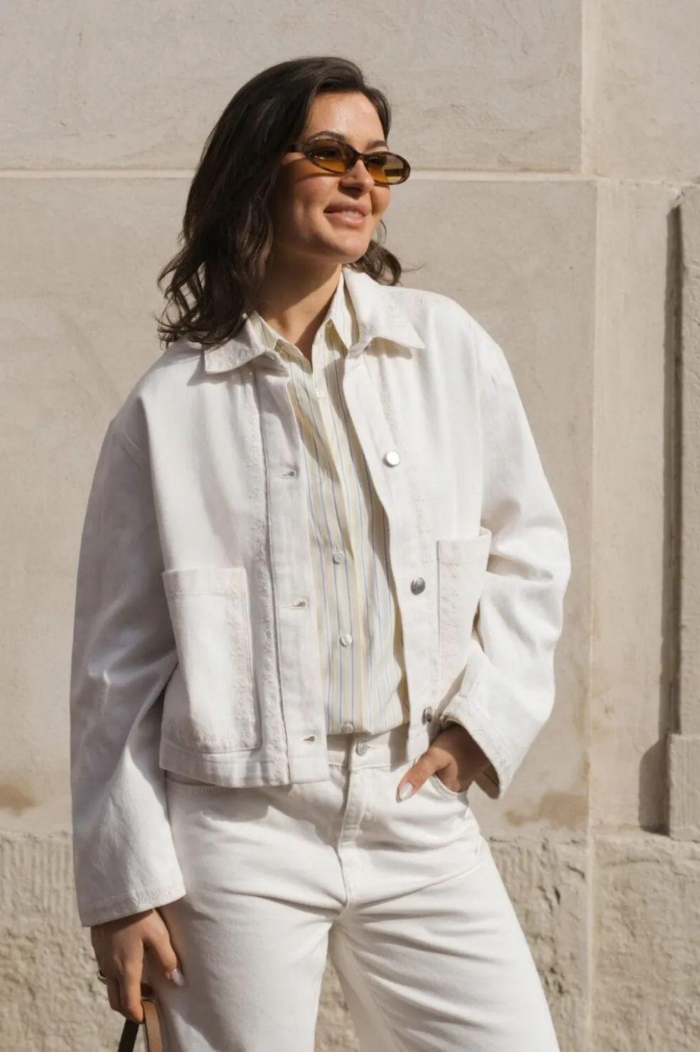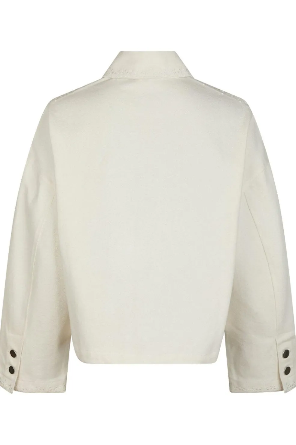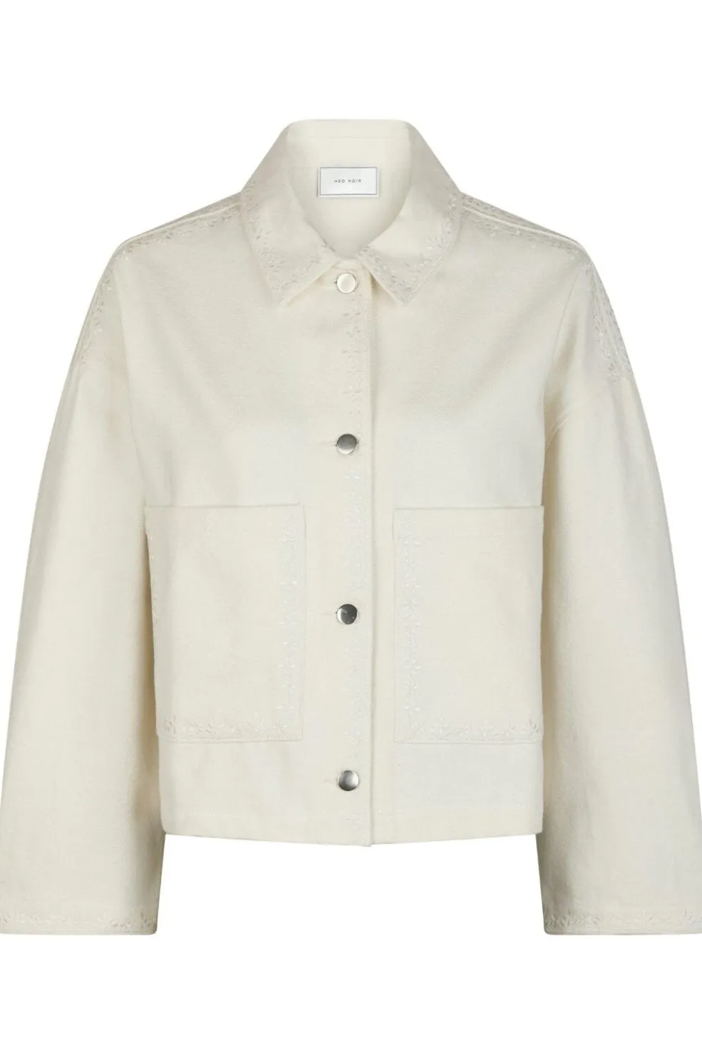 Hvid denimjakke fra Neo Noir med kort, boxy pasform. Jakken har broderede kanter og praktiske lommer foran. Knaplukningen og skjortekraven giver jakken et klassisk udtryk.