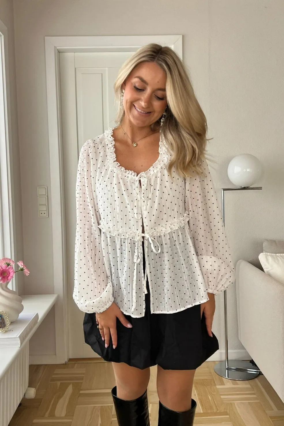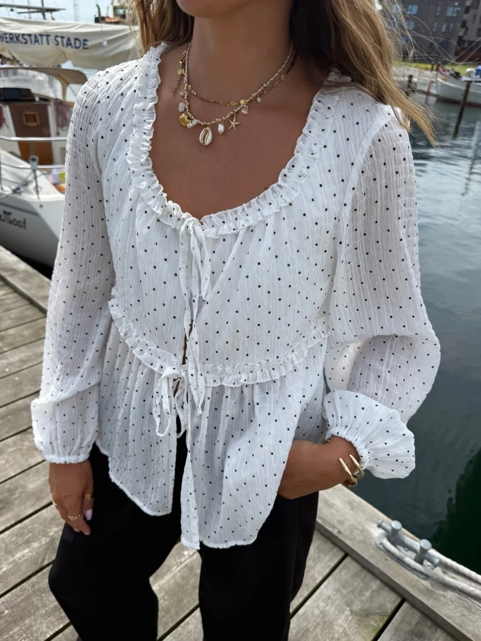 Hvid bluse med sorte prikker fra Dear Molly. Blusen har lange ærmer og en rund halsudskæring med flæser.