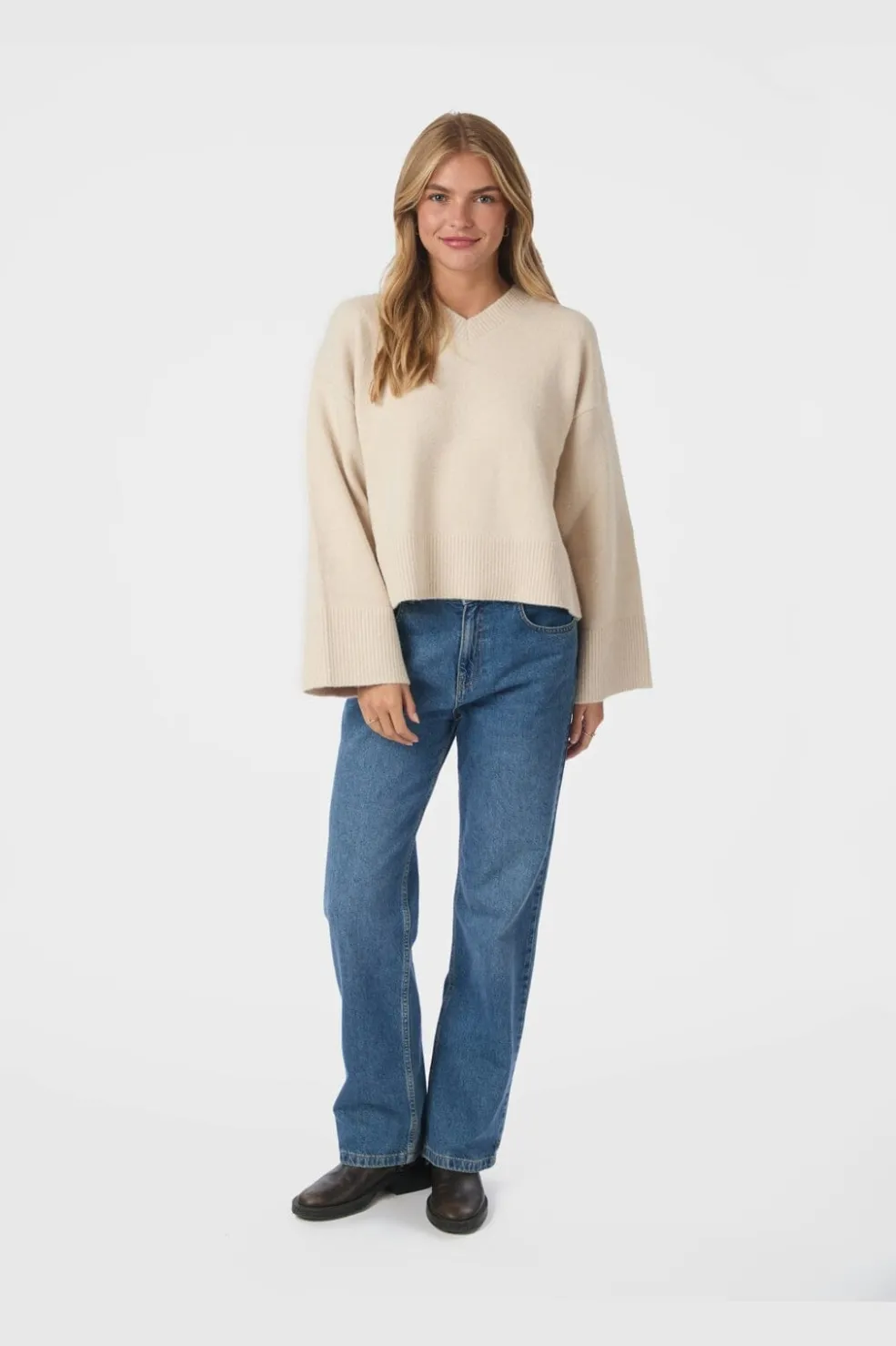 Strikbluse fra Neo Noir i cremehvid. En blød bluse med V-hals og løs pasform. Ribkant ved ærmerne og blusens nederste kant giver struktur til designet.
