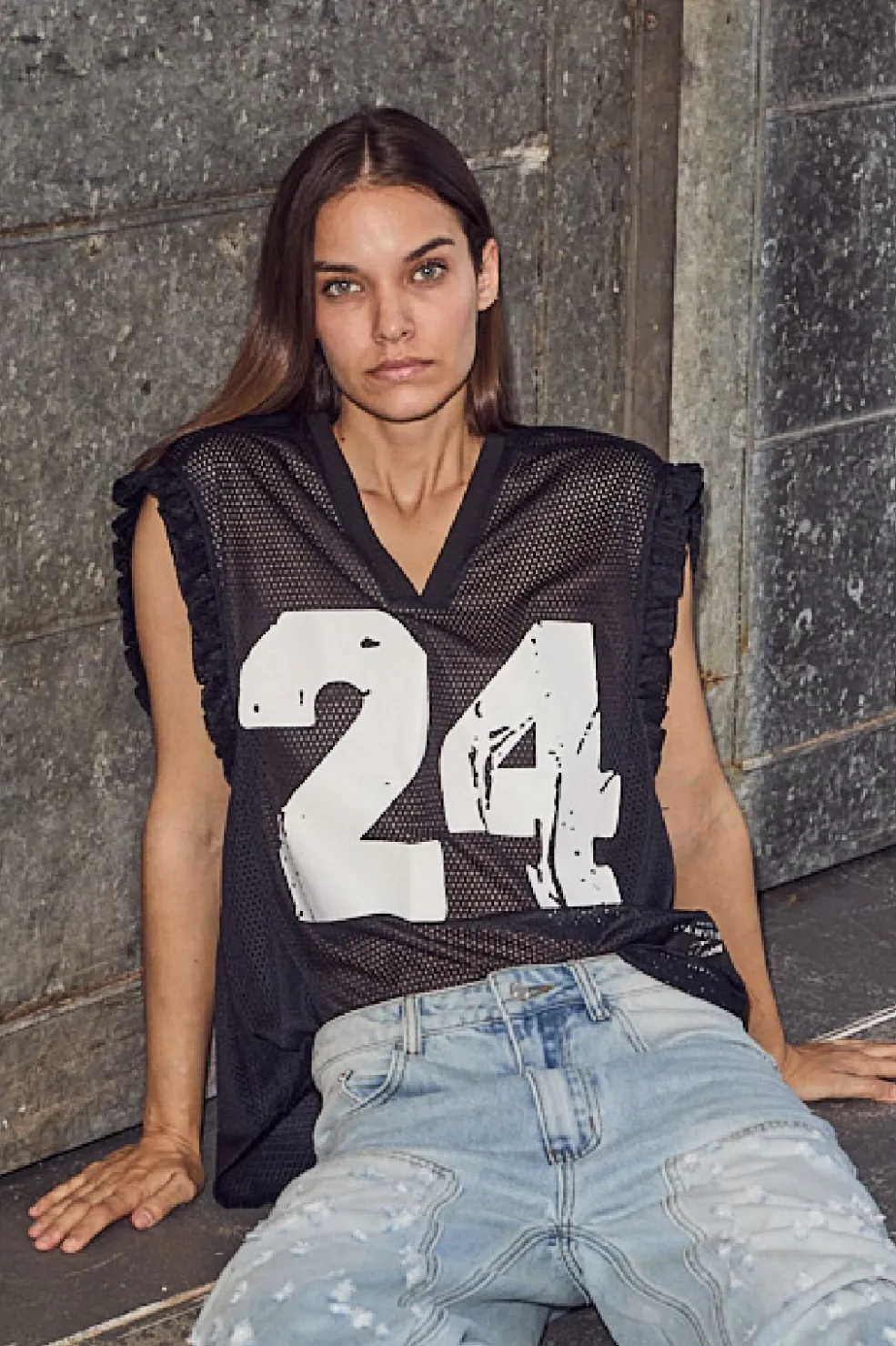 Sort top fra Haute L’Amitié med netstruktur og hvidt 24-print på fronten. Toppen har V-udskæring og flæsedetaljer på skuldrene.