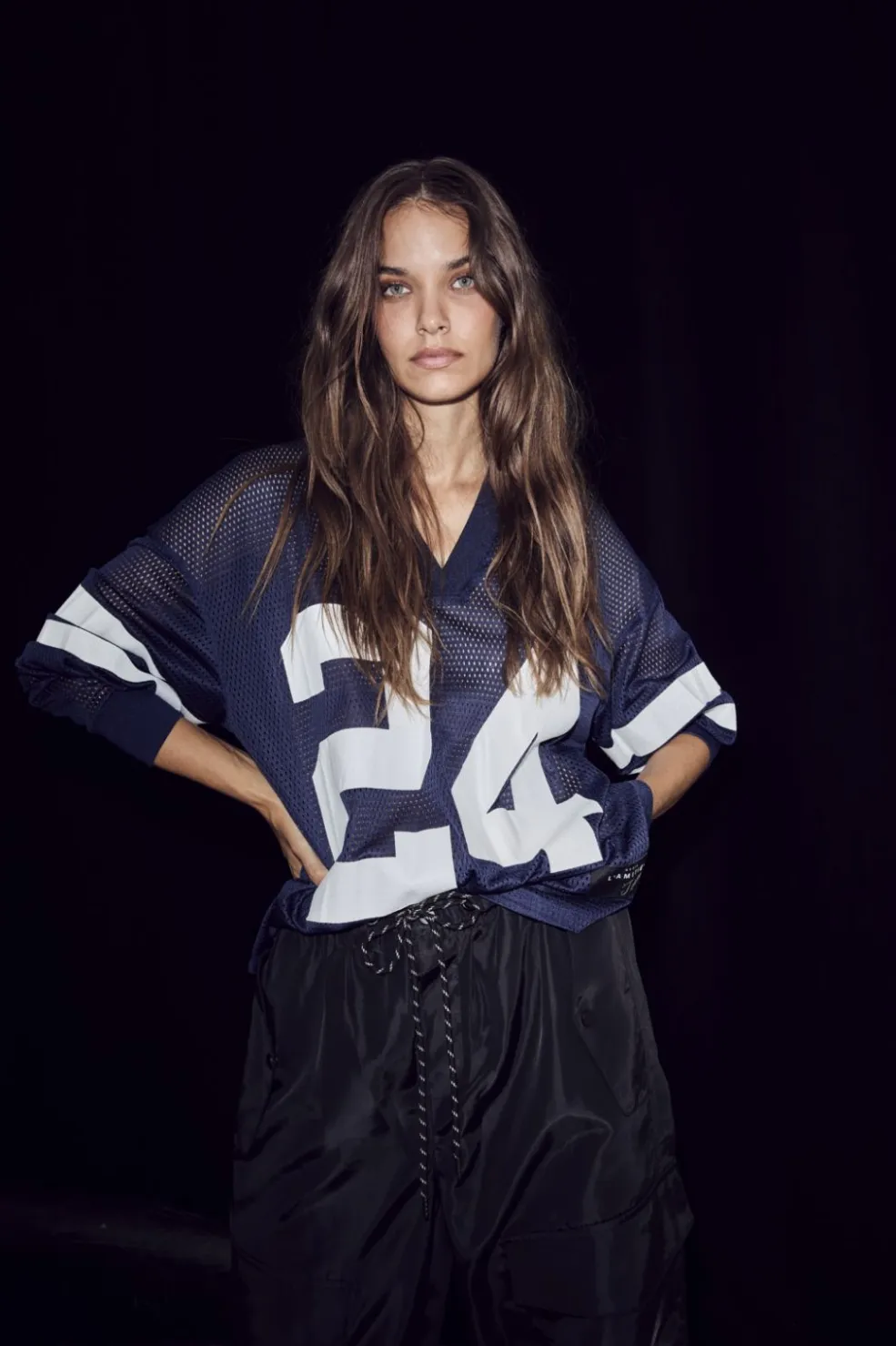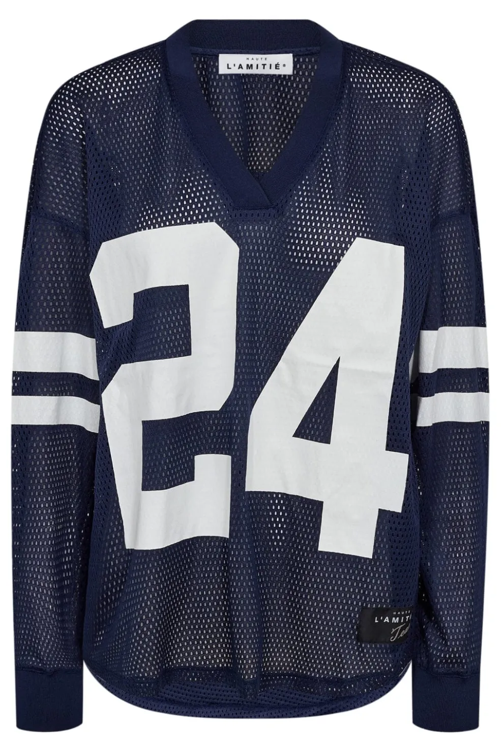 Langærmet t-shirt fra Haute L’Amitié i mørkeblå mesh med hvidt ’24’-print på brystet og hvide striber på ærmerne. Et sporty og maritimt look.