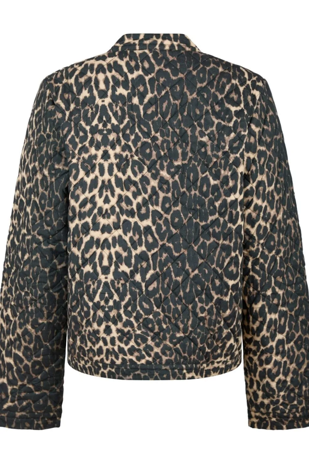 Quiltet jakke fra Neo Noir med leopardprint i brune og beige nuancer. Jakken har V-halsudskæring og dekorative syninger, der fremhæver det quiltede design.