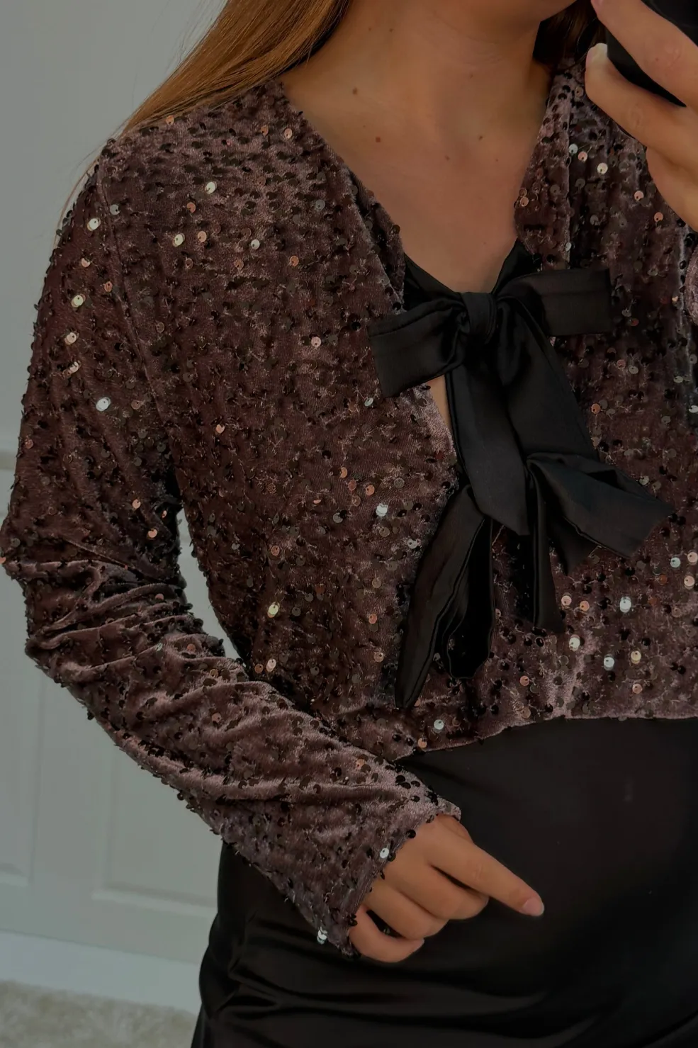 Festbluse fra A-bee i lys maroon med pailletter over hele stoffet. En V-udskæring med sort sløjfe og lange ærmer giver blusen et festligt præg.