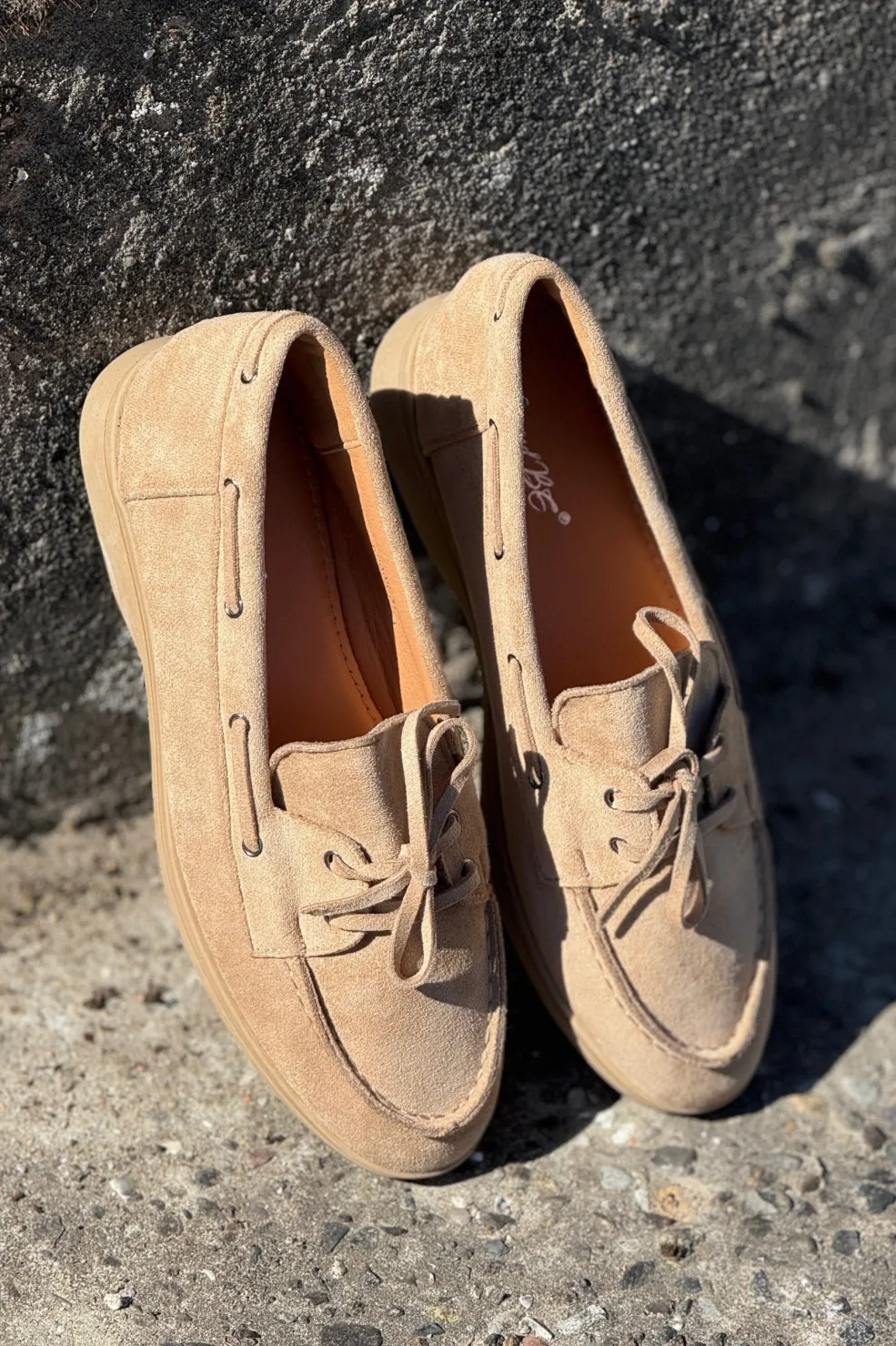 Loafer fra Bloom i en beige nuance. Skoen har snørebånd, en kilehæl og en rund tå.