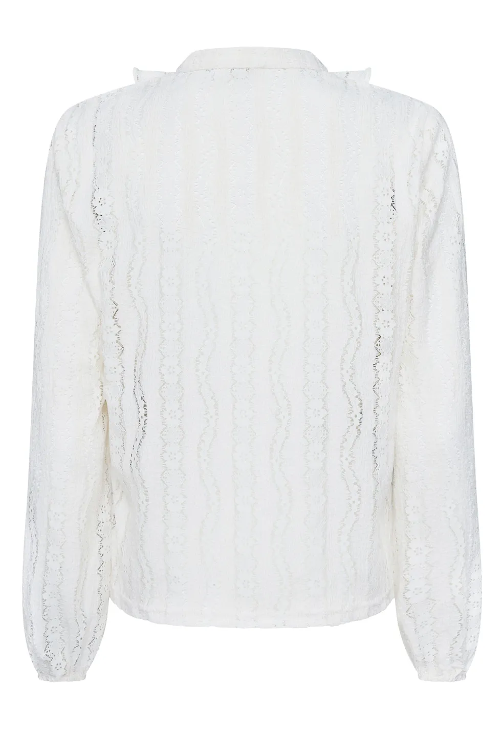 Cremefarvet bluse fra Sisters Point med et lodret blondemønster. Blusen har lange ærmer, V-udskæring med flæser og knaplukning foran.