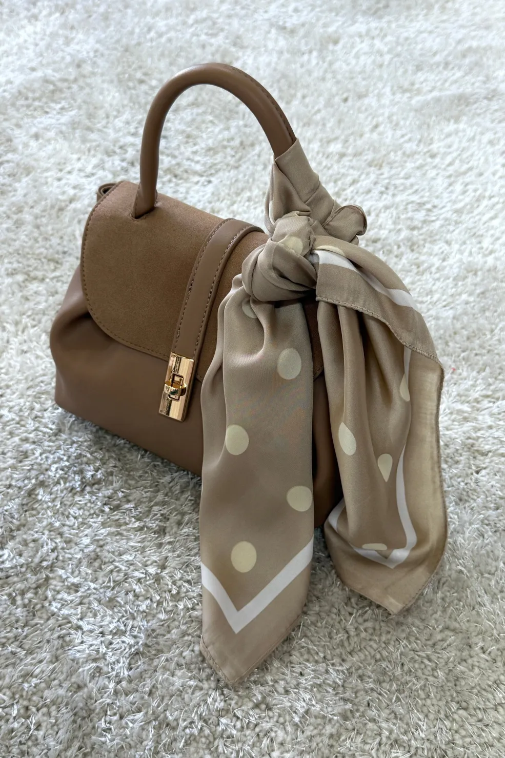 Tørklæde fra A-bee i taupe med hvide prikker og kanter. Den lyse taupe baggrund danner en fin kontrast til det prikkede mønster, og tørklædet kan bruges både om halsen og til tasker.