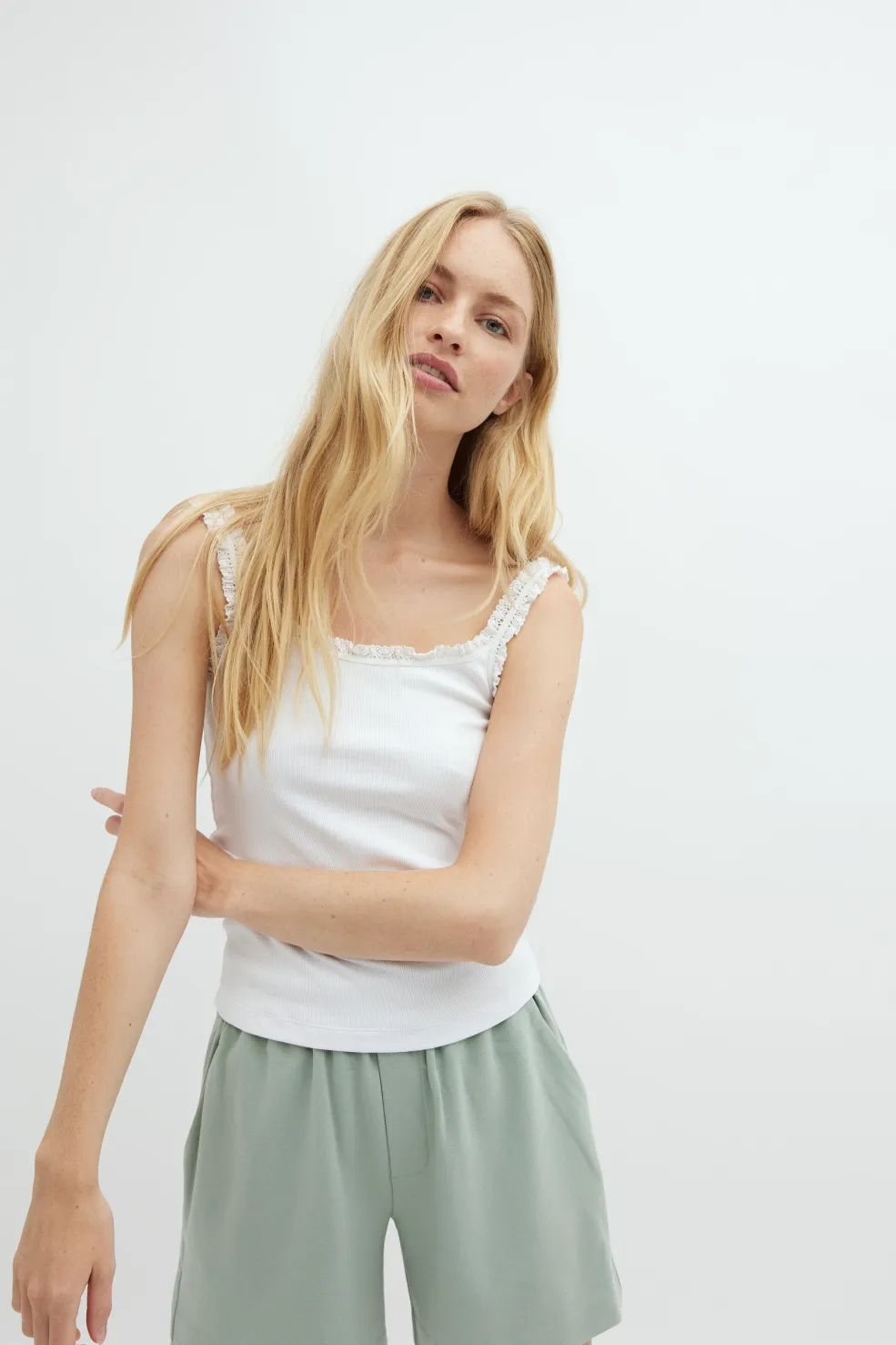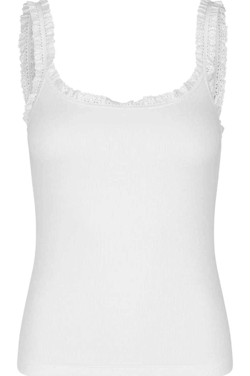 Hvid top fra MbyM med spaghetti-stropper og flæser. Toppen har en firkantet udskæring og er fremstillet i økologisk bomuld med stretch.