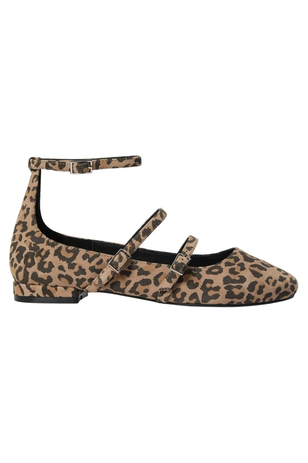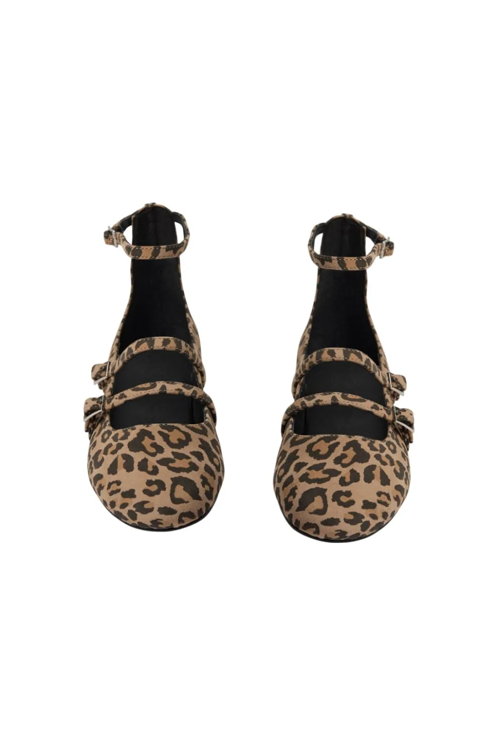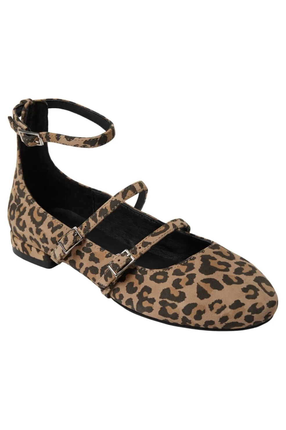 Ballerina fra Sofie Schnoor i ruskind med brunt leopardmønster. Skoen har spænderem og en flad sål. Den er fremstillet i ruskind med detaljer i læder.