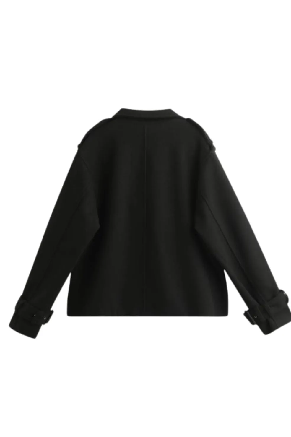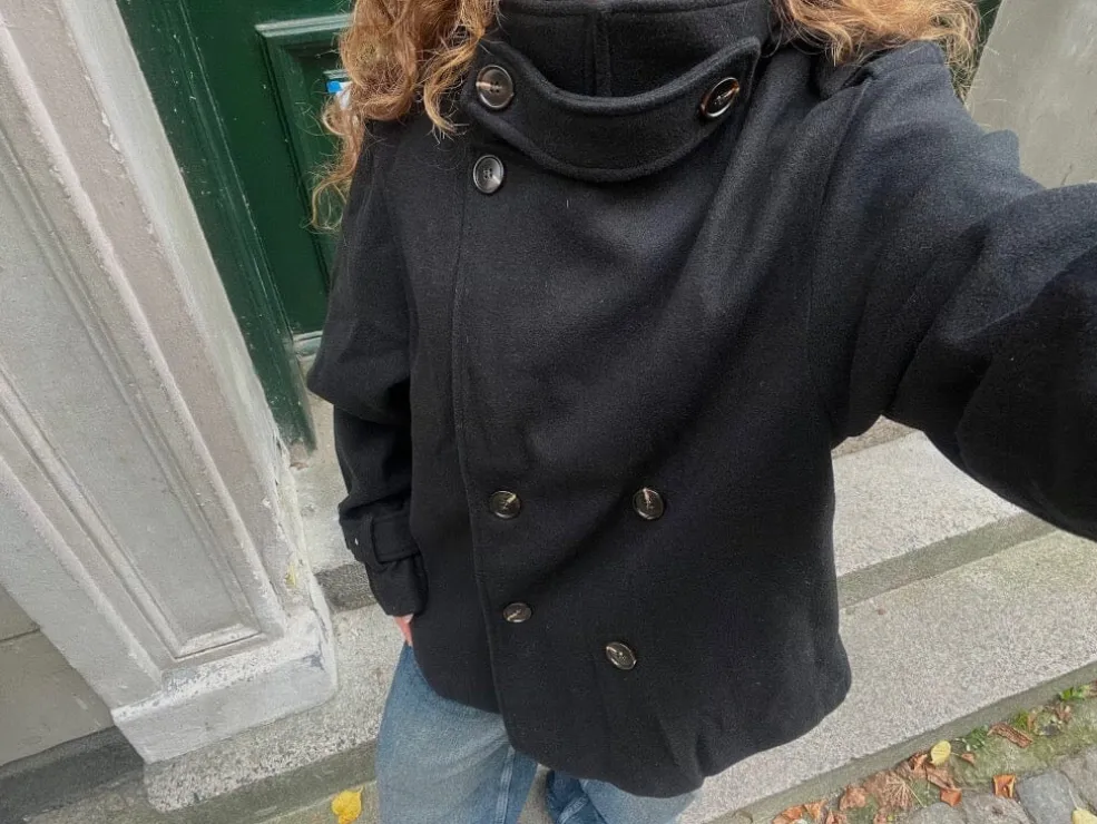 Sort jakke fra A-bee, lavet af polyester. Jakken har et klassisk design med dobbelt række knapper og en høj krave.