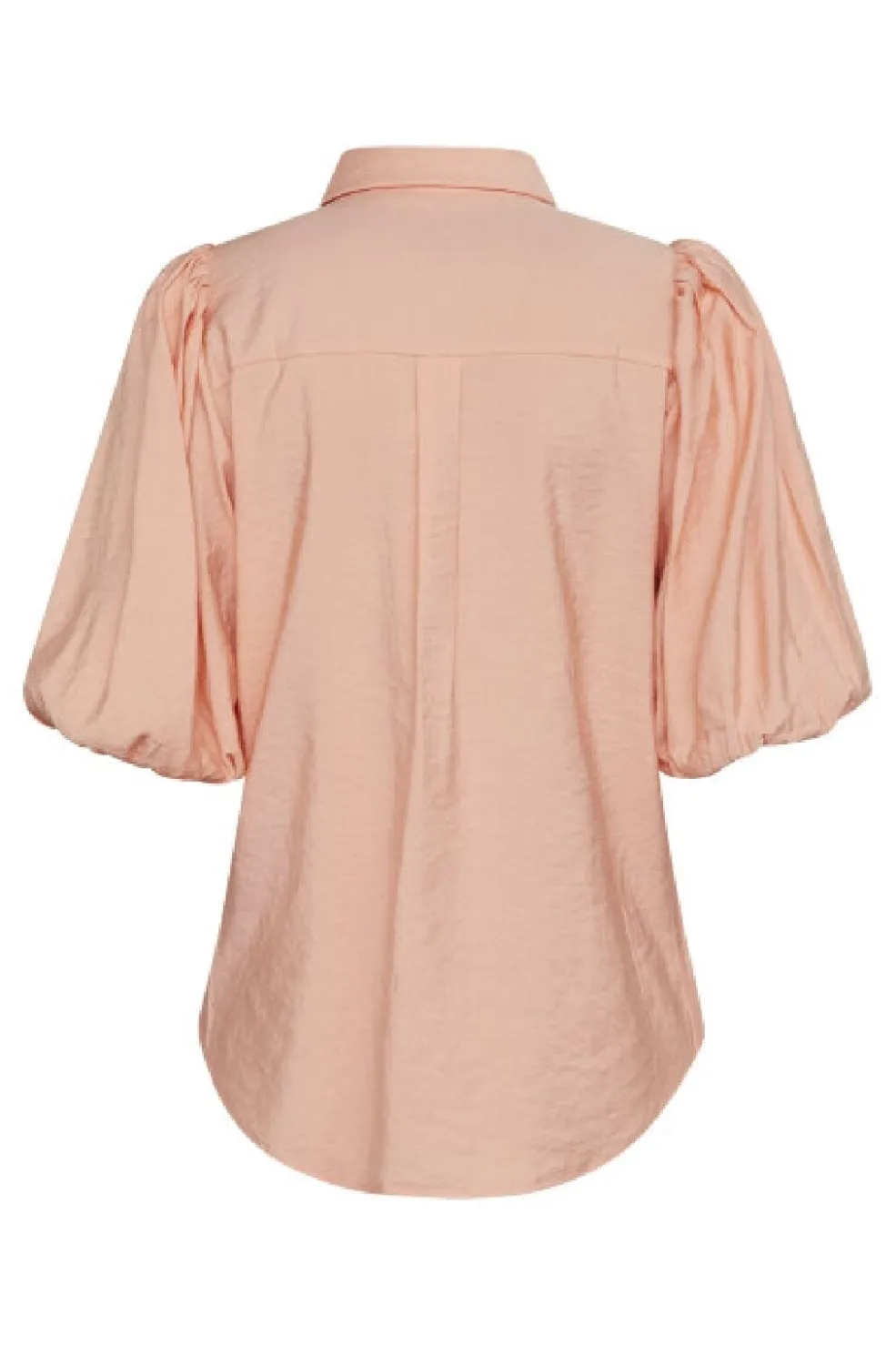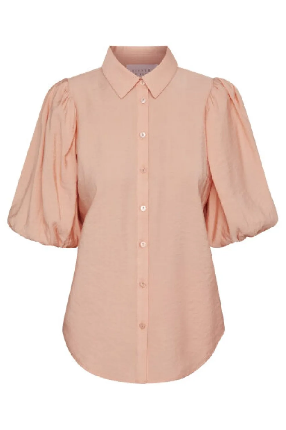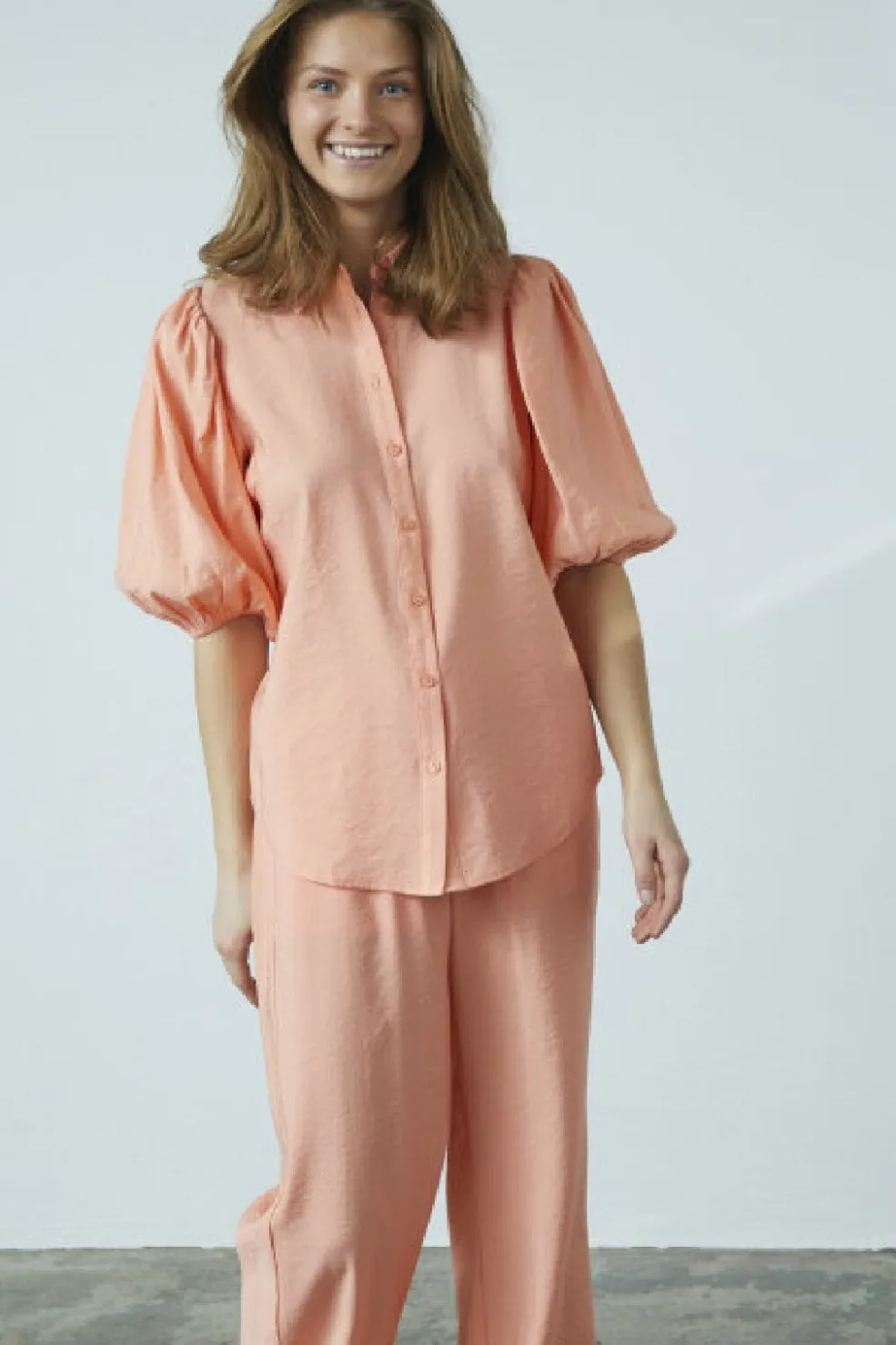 Koralfarvet skjorte fra Sisters Point med trekvartlange pufærmer og klassisk krave. Skjorten har knaplukning foran og en normal pasform.
