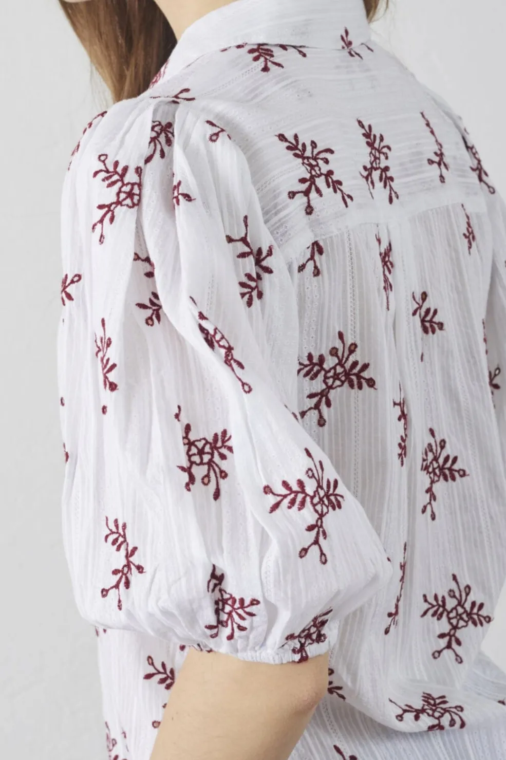 Hvid bluse fra Sisters Point med bordeauxfarvet blomsterbroderi. Den har skjortekrave, knaplukning foran og korte pufærmer i et let vævet materiale.