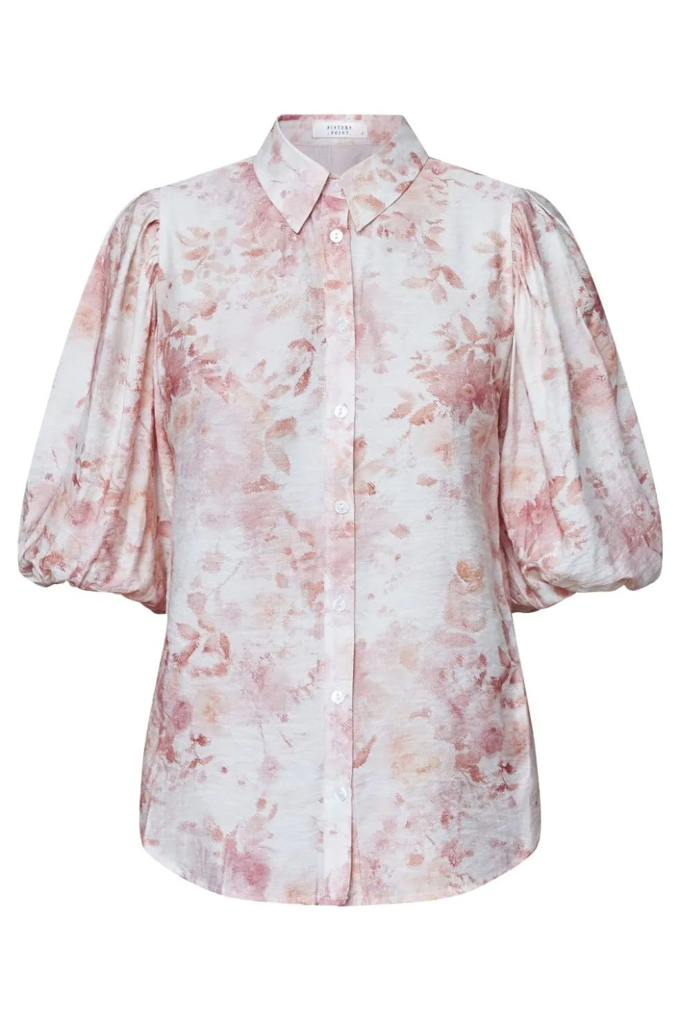 Skjorte fra Sisters Point med blomsterprint i lyserød og orange på hvid bund. Den har pufærmer i 3/4 længde, skjortekrave og knaplukning foran.