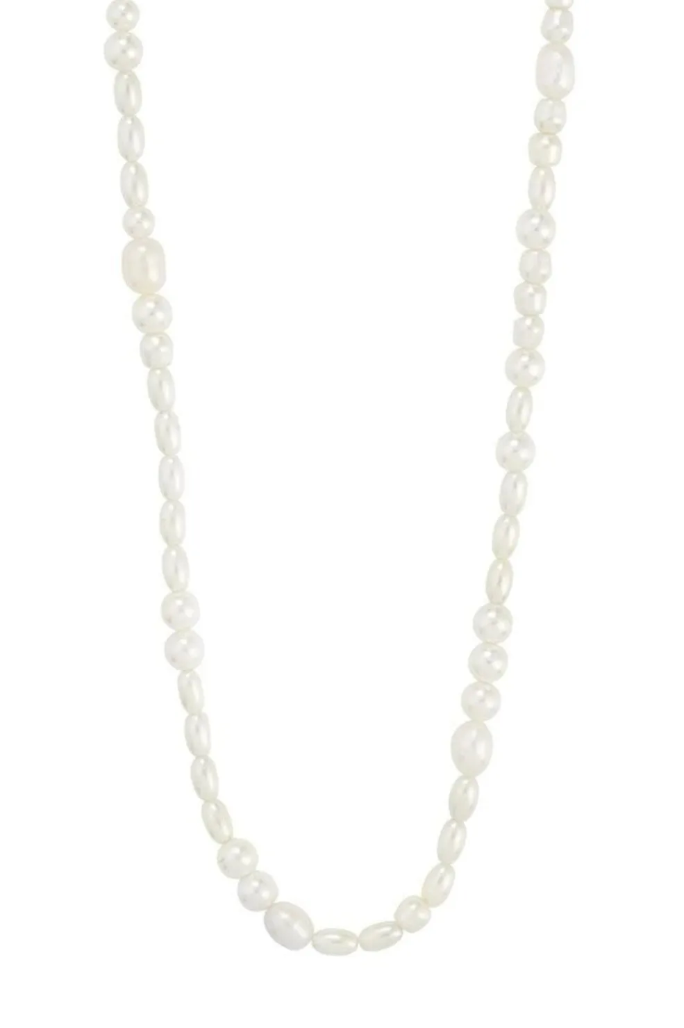 Sølvbelagt halskæde fra Pilgrim med ovale perler i perlemorsfarver. En kombination af ægte ferskvandsperler og glasperler giver halskæden et naturligt udtryk.