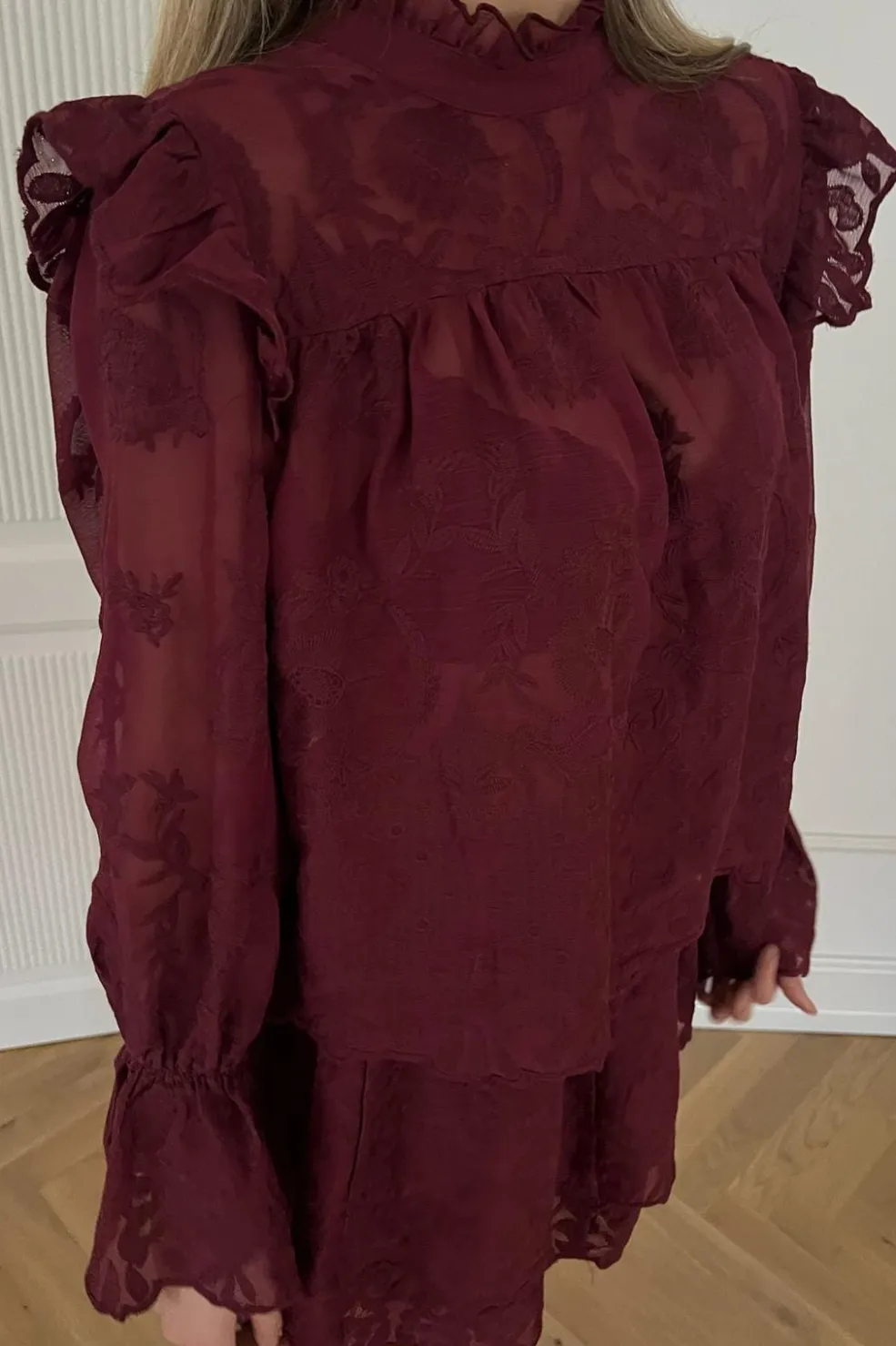 Blondeskjorte fra BYIC i dyb bordeauxrød. Skjorten har et gennemgående blomstermønster i blonder og flæsedetaljer på skuldrene. Den høje hals og de lange ærmer giver skjorten et romantisk udtryk.