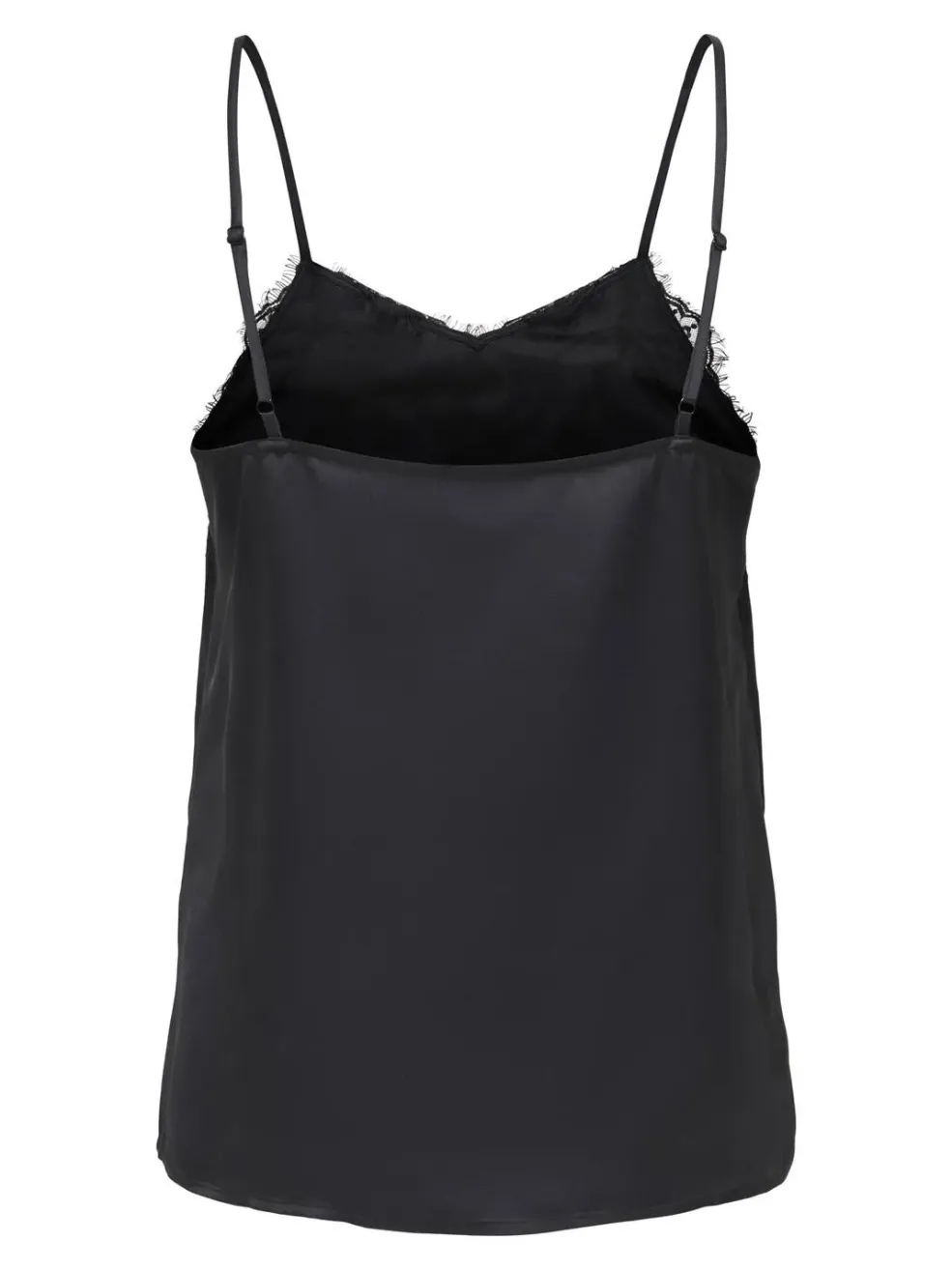 Sort singlet fra JDY med blondedetaljer langs halsudskæringen. Singletten har tynde spaghetti-stropper og en V-hals i sort farve.