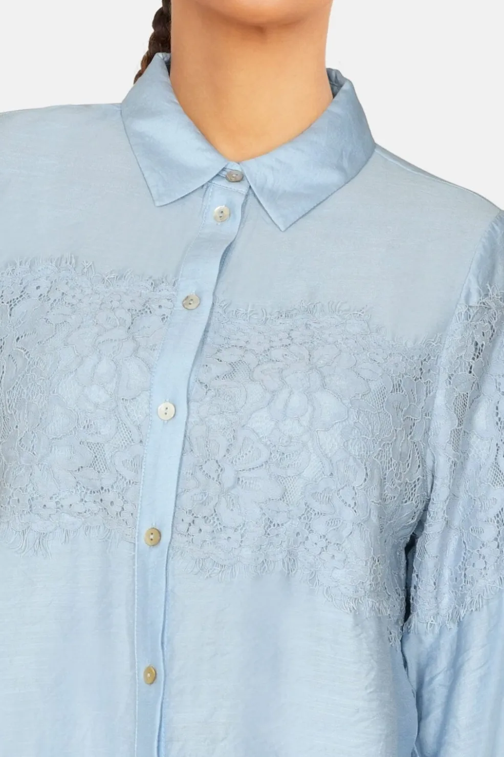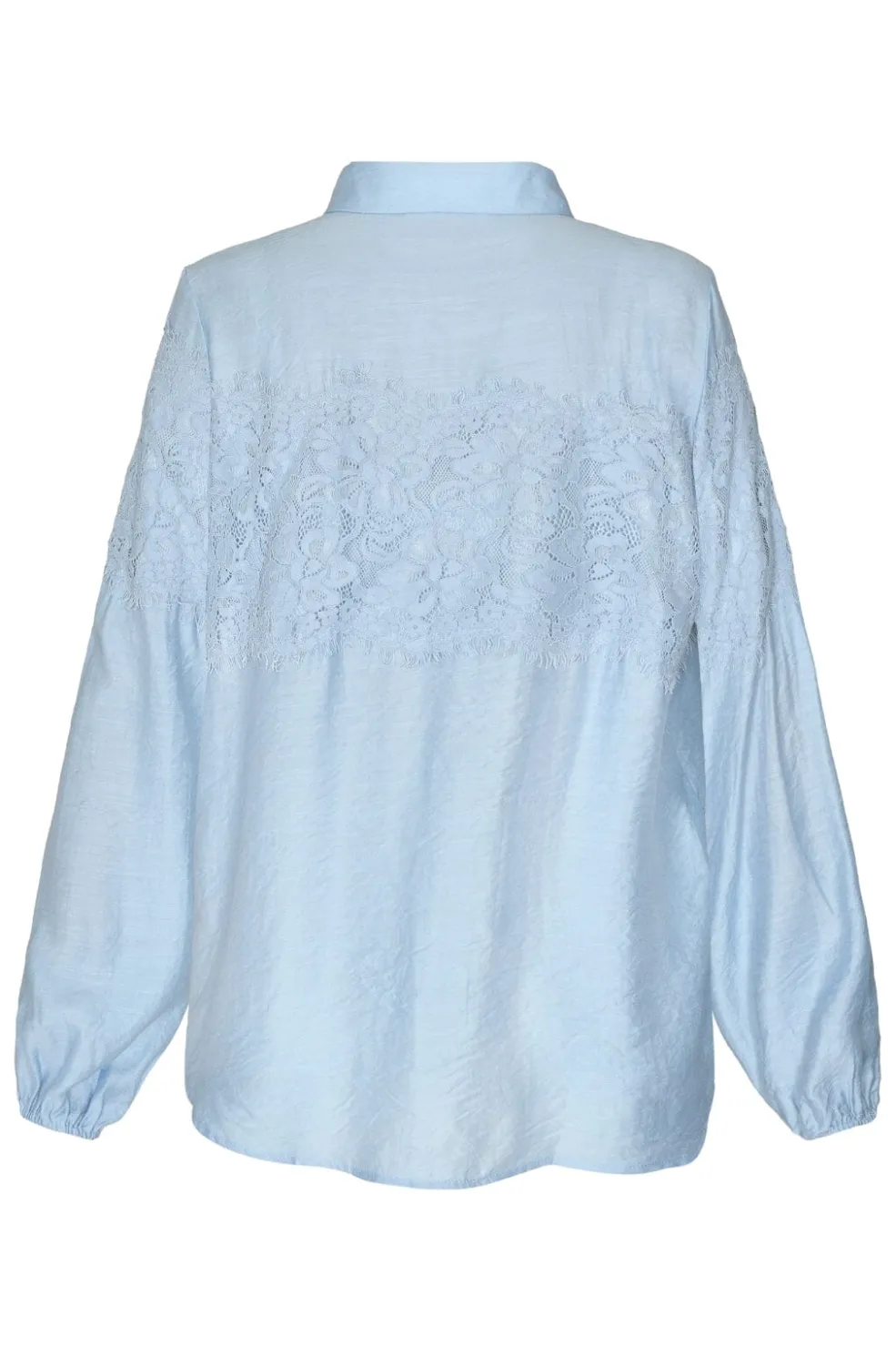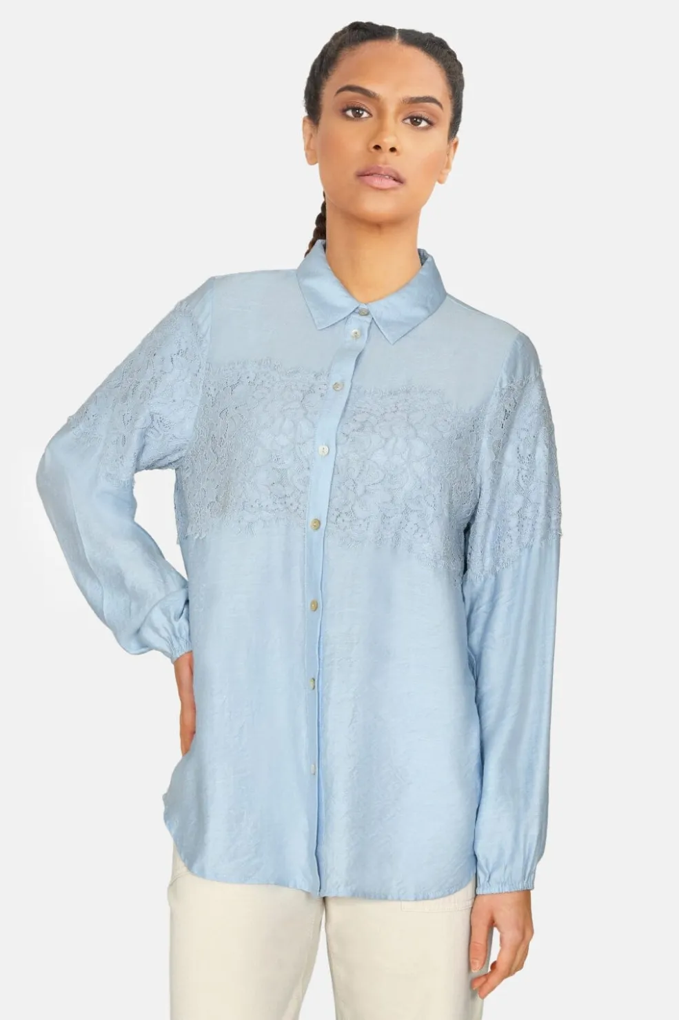 En løstsiddende ensfarvet skjorte med et blondestykke henover brystet, ryggen og ærmerne. Modellen er 172 cm og har en størrelse S på.